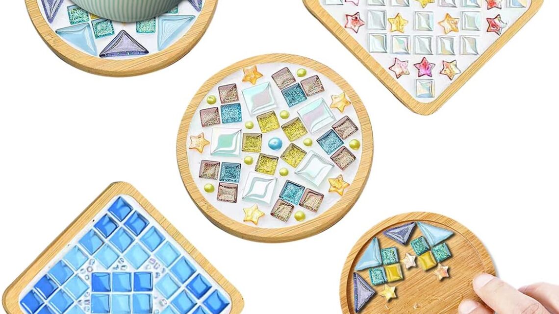 WATHFKCU 4 Sets DIY Glass Mosaic Tiles for Crafts,Mixed Color Mosaic Kits with Wooden Coaster for Adults,Mosaic Crafts Materials Package for Coaster Handmade Home Decor Gifts
