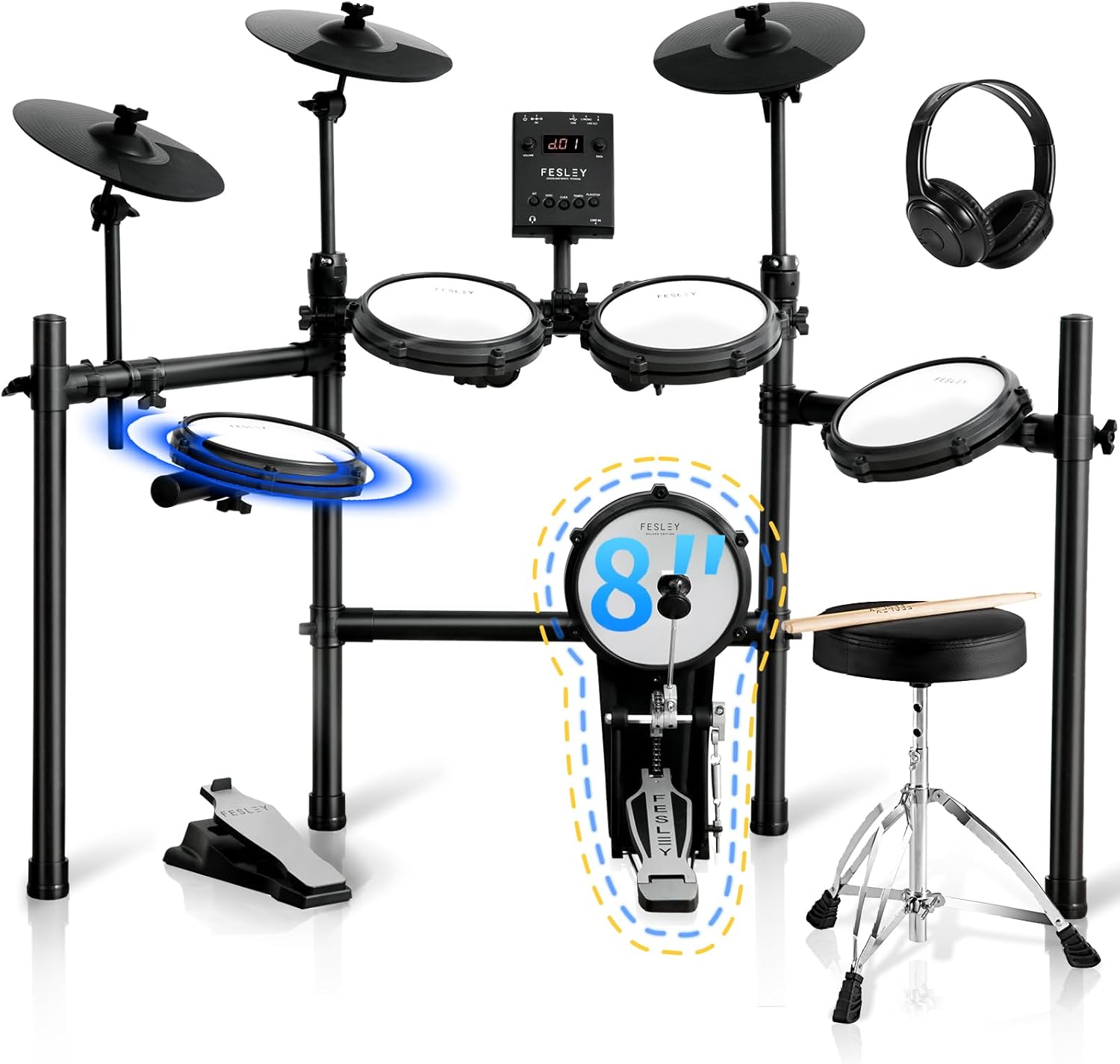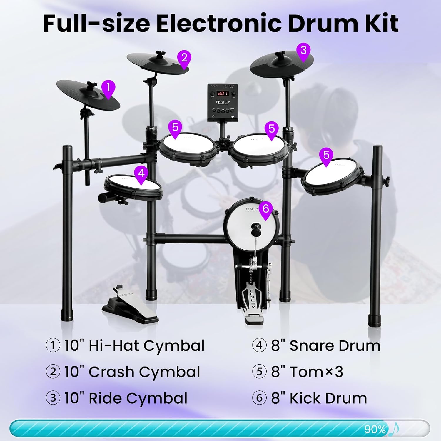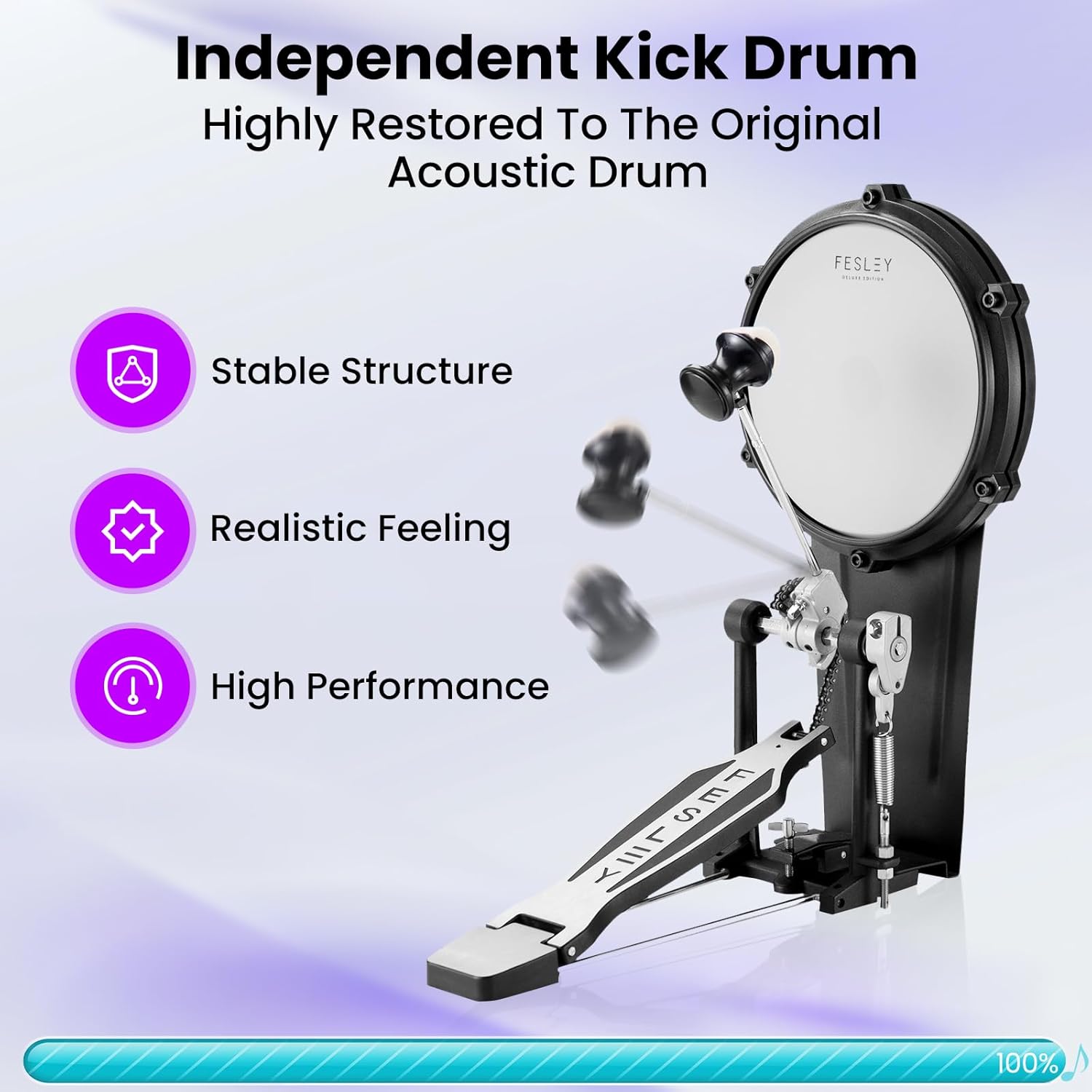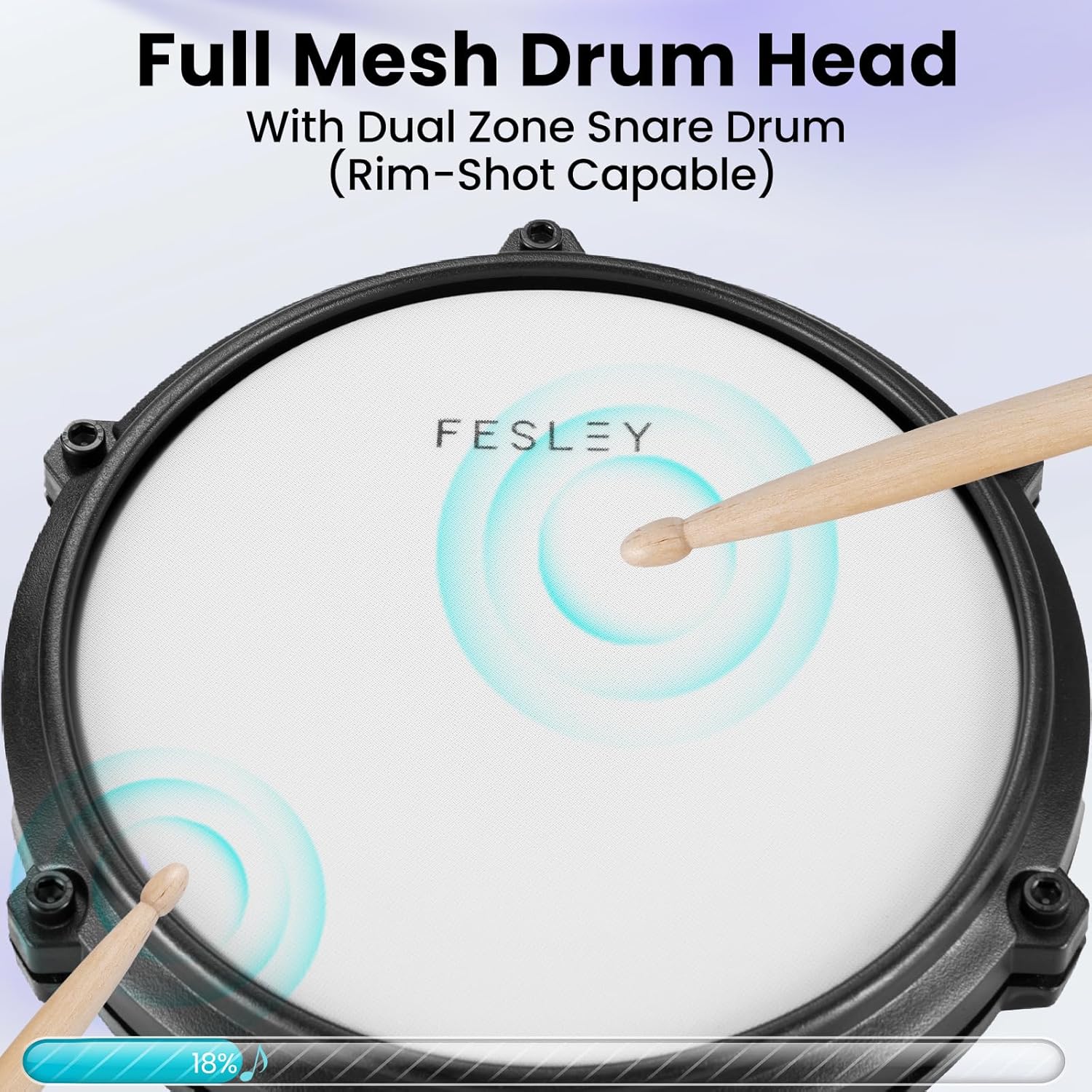 Fesley Electric Drum Set with Independent Kick Drum Electronic Drum: Dual Zone Snare Drum Electric Drum Set, Quiet Mesh Drum Pads For Beginner, 3 Cymbals with Choke, USB MIDI, Drum Throne, Drum Sticks