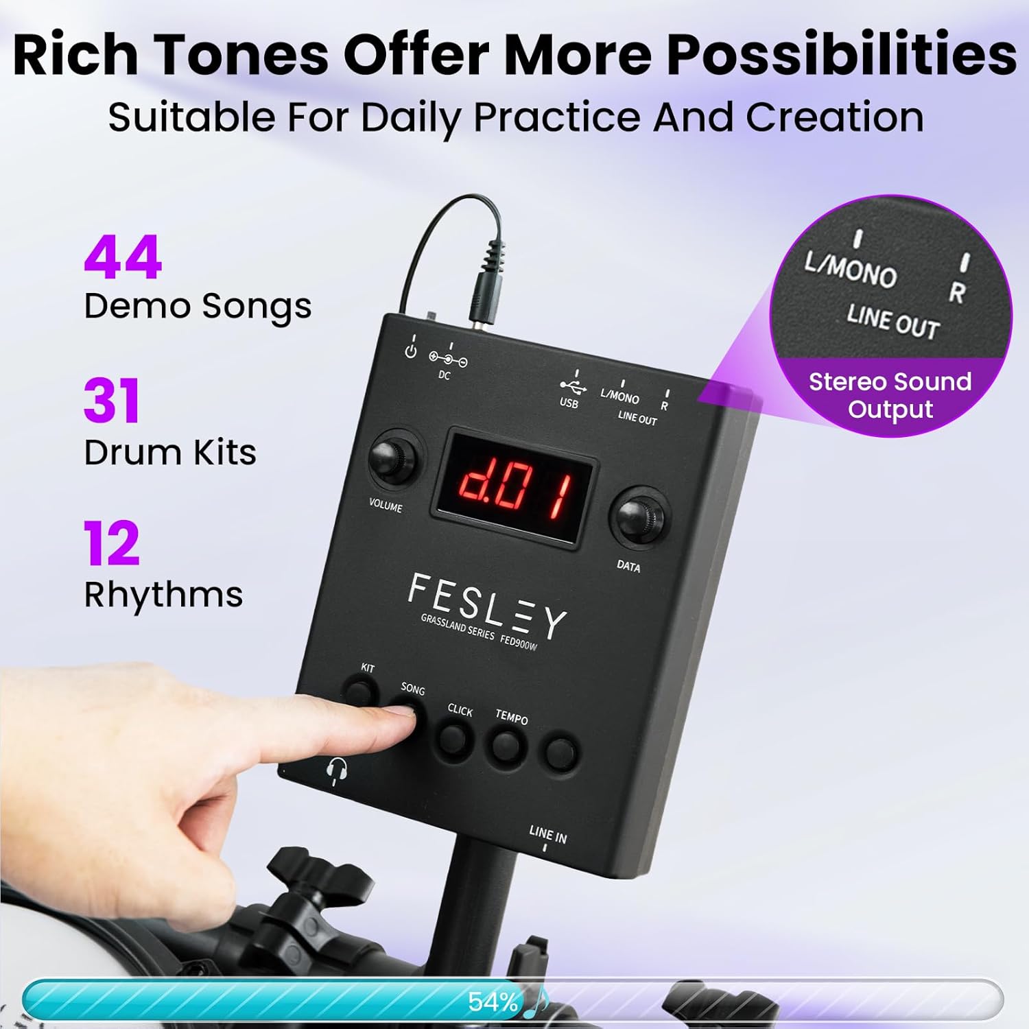Authentic Drumming Experience: The FED900W electric drum set uses upgraded second generation double mesh drum skins that not only faithfully mimic the sound of acoustic drums, providing a realistic feel and response to your playing. It’s also much quieter than traditional drum pads, making it ideal for practicing at home without disturbing your neighbors or family.