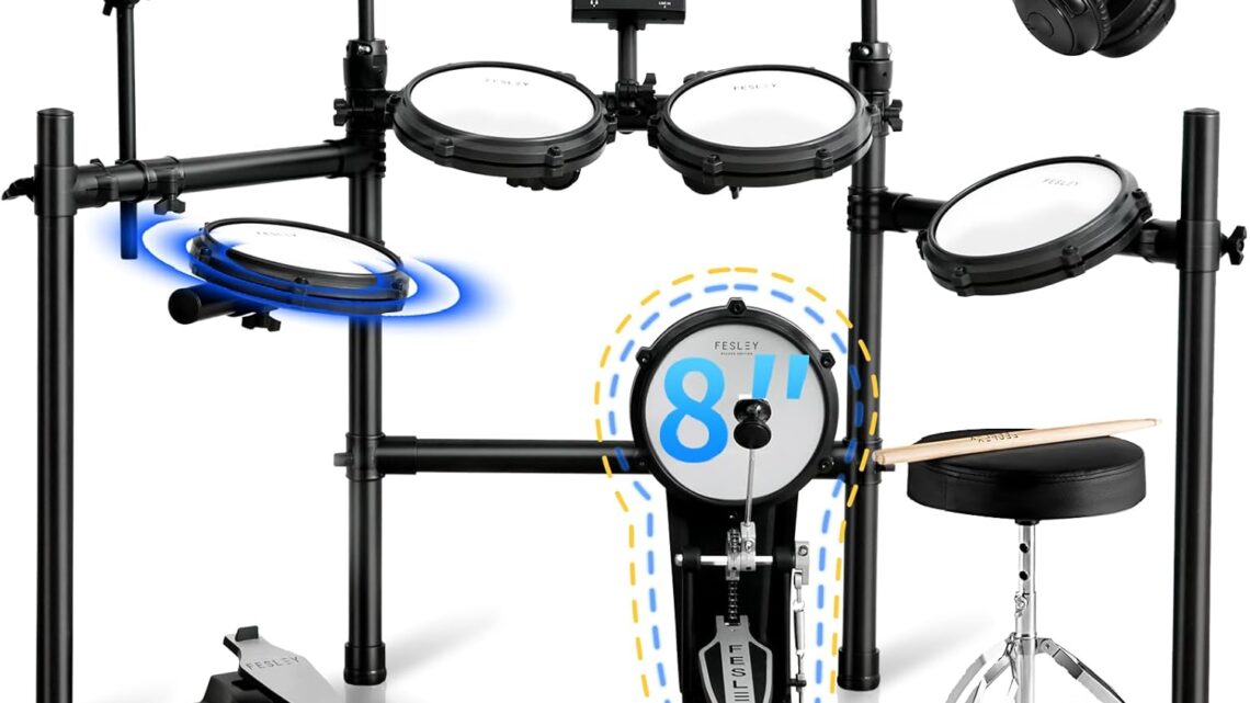 Fesley Electric Drum Set with Independent Kick Drum Electronic Drum: Dual Zone Snare Drum Electric Drum Set, Quiet Mesh Drum Pads For Beginner, 3 Cymbals with Choke, USB MIDI, Drum Throne, Drum Sticks