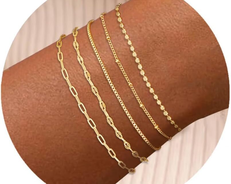 Gold Bracelets for Women, Trendy Adjustable 14K Gold Plated Stackable Link Bracelet, Dainty Thin Paperclip Chain Bracelets Stack Set
