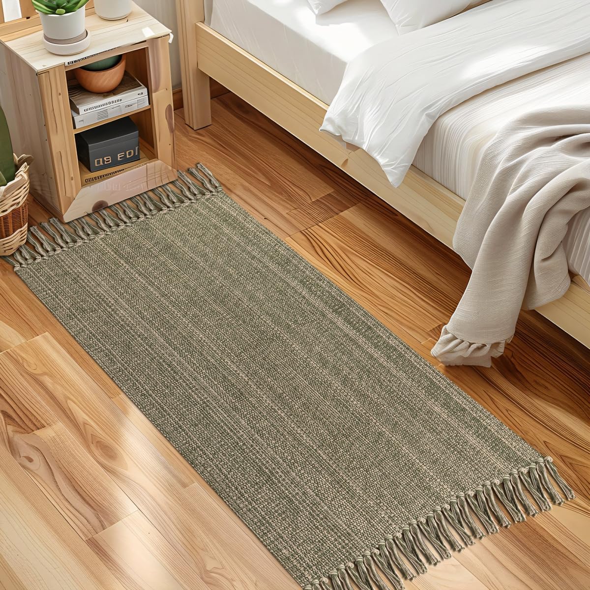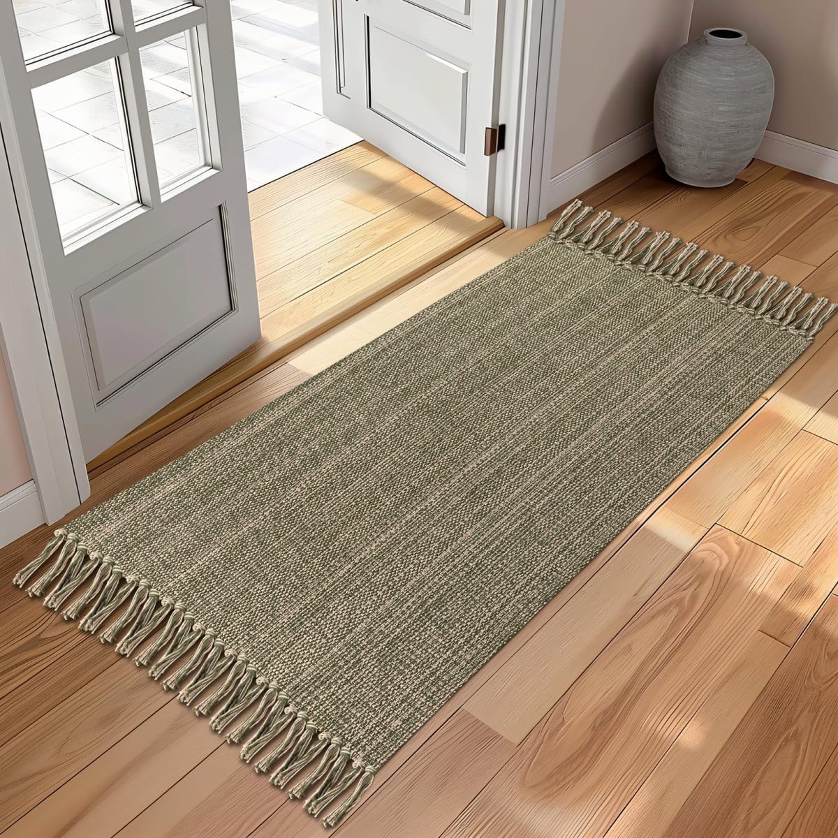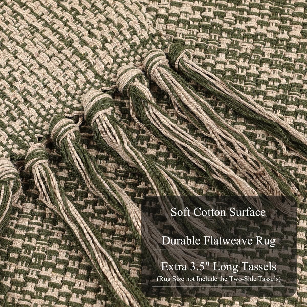 Kitchen Runner Rug, 2′ x 4.3′ Hand-Woven Reversible Washable Bathroom Rug with Tassels, Olive Green Tan Cotton Braided Boho Farmhouse Rug Hallway Throw Carpet for Foyer Bedroom Entry Back Door