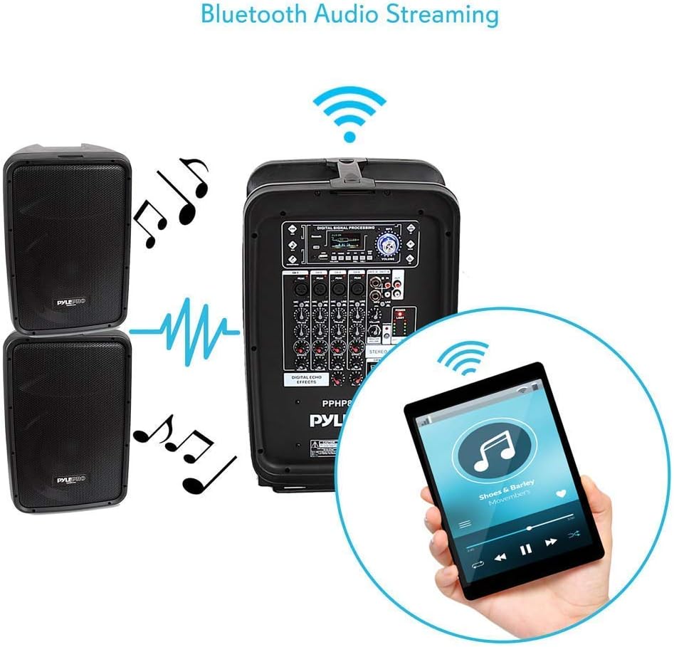 BLUETOOTH AUDIO STREAMING: The PA loud speaker set features bluetooth for wireless audio streaming and works with devices like iPhone, android mobile phone, iPad, tablet, PC. Ideal for personal indoor home and outdoor use