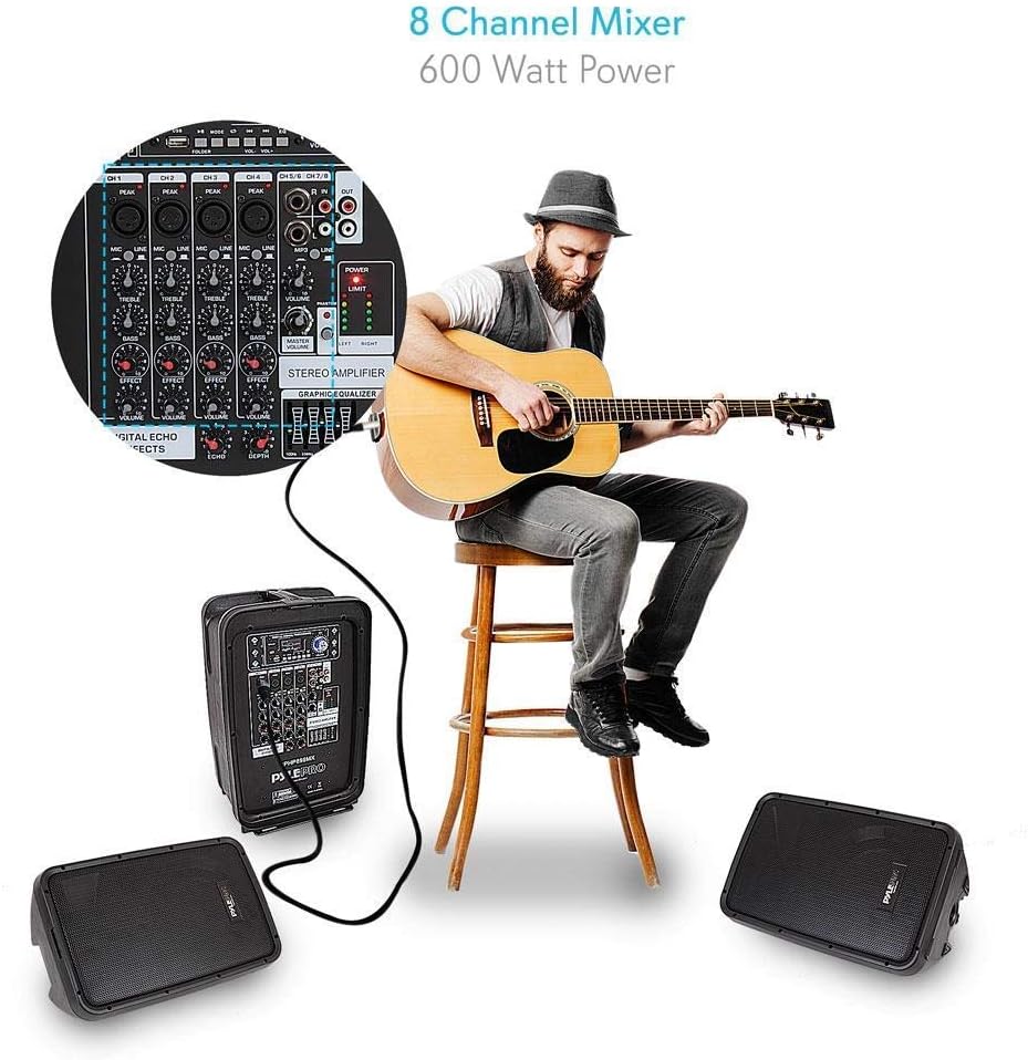 8 CHANNEL MIXER: This portable stage and studio PA speaker system by Pyle features an 8 channel powered amplifier console audio mixer with digital LCD display which is perfect for mixing audio from multiple sources.