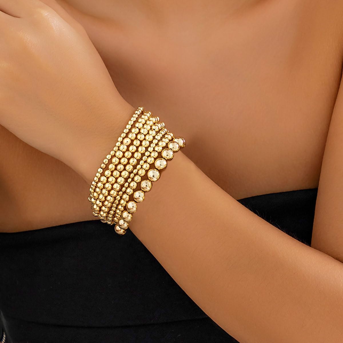 7Pcs Gold Beaded Bracelets Set for Women Stretch Bracelet Bead Ball Stackable Chunky Bracelet Jewelry Trendy and Dainty Bracelet Set
