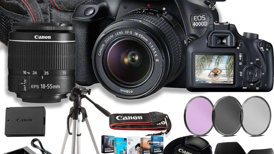 Canon EOS 4000D / Rebel T100 DSLR Camera w/EF-S 18-55mm F/3.5-5.6 Zoom Lens + 64GB Memory, Filters,Case, Tripod, Flash, and More (34pc Bundle) (Renewed)