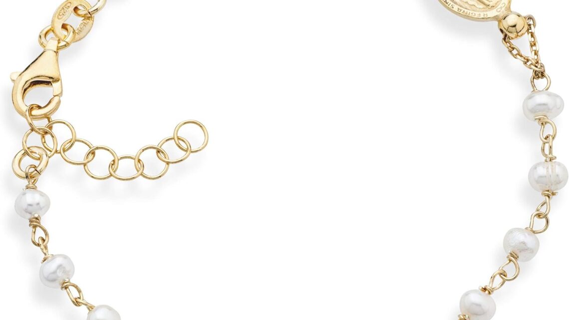 Miabella 18K Gold over 925 Sterling Silver Handmade Italian 3.5-4mm White Cultured Freshwater Pearl Rosary Cross Charm Bead Bracelet for Women, Adjustable Link Chain, 925 Italy