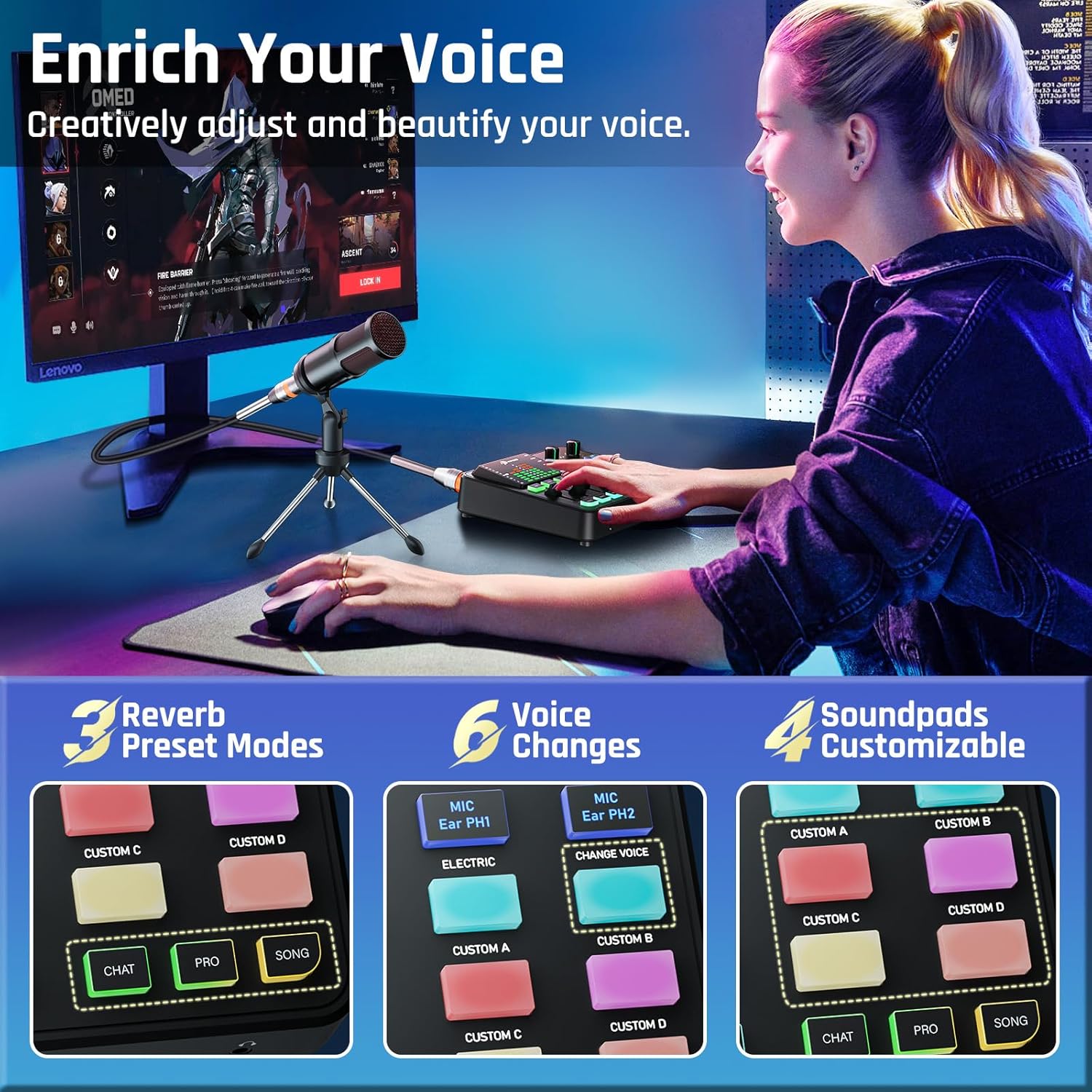Customize Your Audio: This gaming audio mixer features six voice-changing modes, allowing you to easily experiment with different sounds or add a touch of humor to your games. With four customizable soundpads, you can add and trigger your favorite sound effects on the spot, bringing increased creativity and interaction to your gaming or streaming. Additionally, three reverb presets offer a fresh audio experience, helping you present the best voice state in more scenarios.