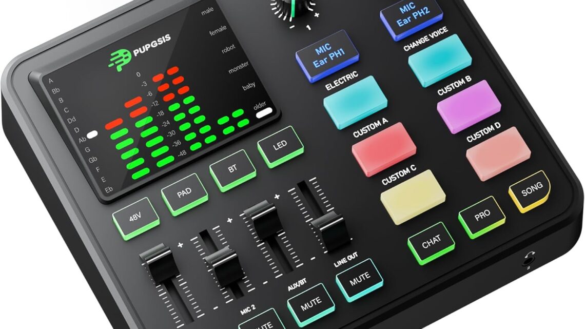 PUPGSIS Gaming Audio Mixer, Audio Interface with Pro-preamp, 48V Phantom Power, Bluetooth 5.3, RGB Lighting, PC Sound Board for Streaming, Podcasting, Recording, Content Creation