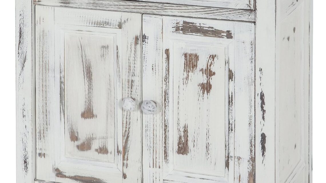 Rustic Cottage Accent Cabinet with 1 Drawer and 2 Doors, White Antique – Living Room Furniture, Functional Design with Dental Work and Turned Legs, Wipe Clean with a Dry Cloth