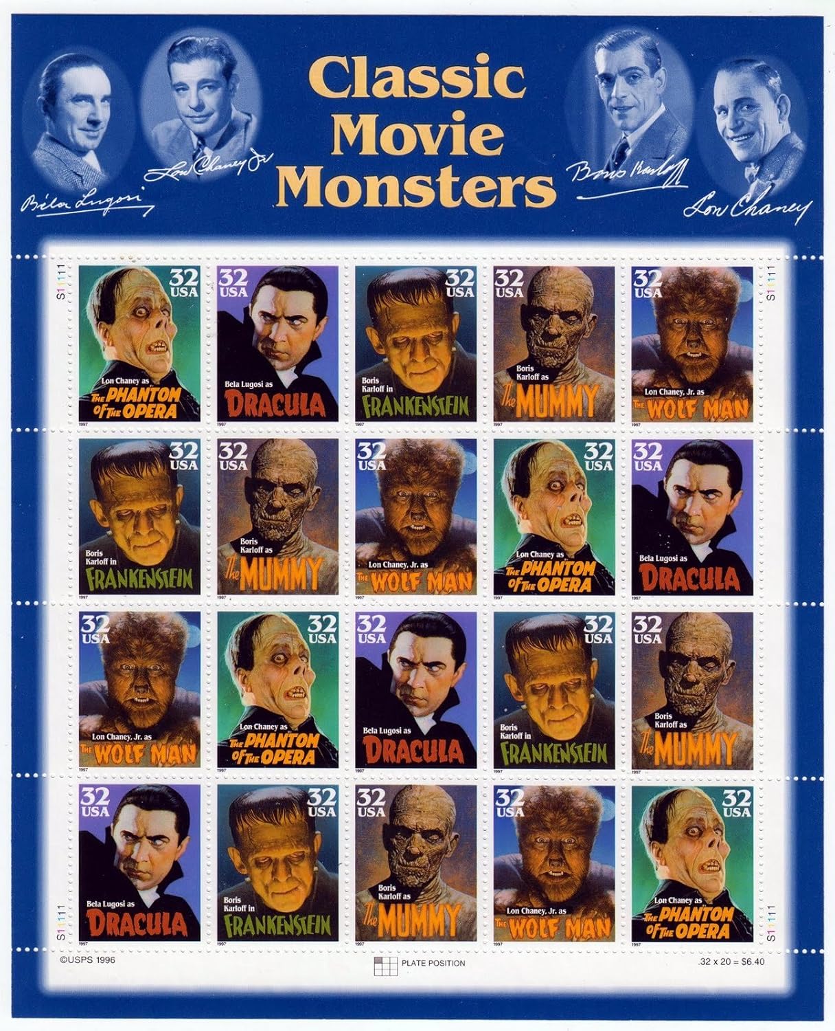 New sheet of (20) stamps (catalog #3168) no longer sold by USPS. Plate #/position varies., Features 5 images: The phantom of the opera, Dracula, Frankenstein, the mummy, the wolf man, perfect gift for fans of movies, horror films, Bela Lugosi, Boris Karloff. Suitable for framing., Great for raffles, conference giveaways, fan clubs, fundraisers, souvenirs. Collectors item., High quality item professionally packaged in a white stay flat envelope.