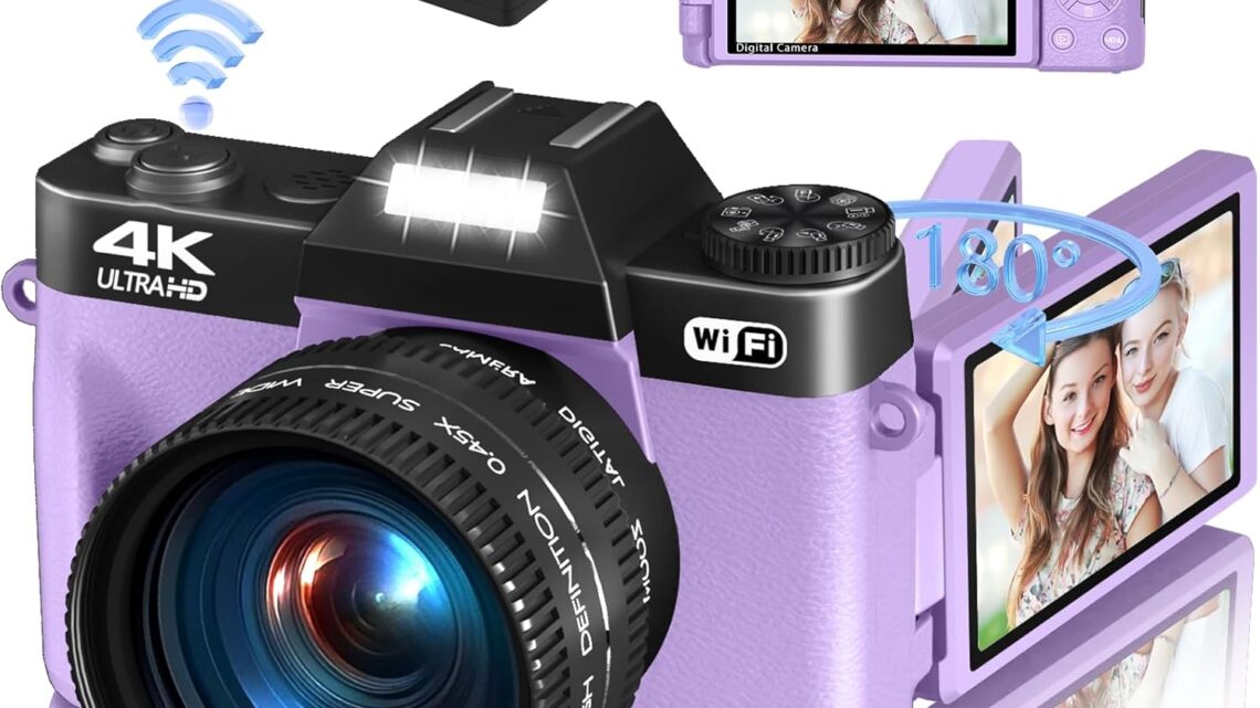 4K Digital Camera for Photography & Vlogging, 56MP YouTube Camera with WiFi, 3″ 180° Flip Screen, 16X Digital Zoom, 52mm Wide Angle & Macro Lens, 32GB TF Card, 2 Batteries – Purple