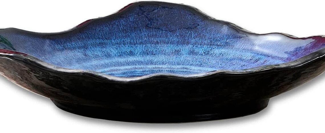 Ceramic Decorative Dish, Large Blue Pottery Decorative Bowl, Porcelain Centerpiece Tray, Key Bowl, Gift Decor Tray for Tabletop Entryway Table Living Room Dining(12” Dish)