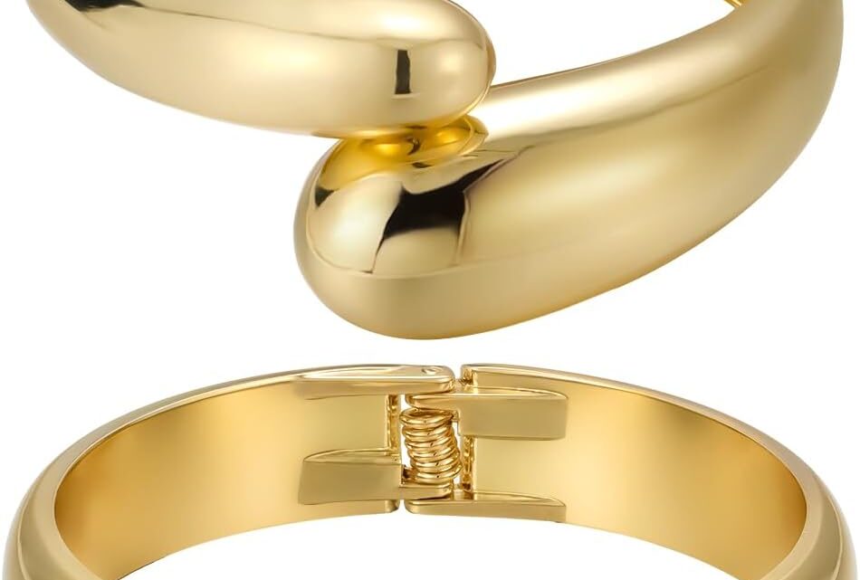 Cuff Bracelet Stack, 18K Gold-plated Open Bangle Bracelet, Teardrop Hinged Thick Wrist Chunky Bracelet Set for Women, Non Tarnish Jewelry Gift, 2 Pack
