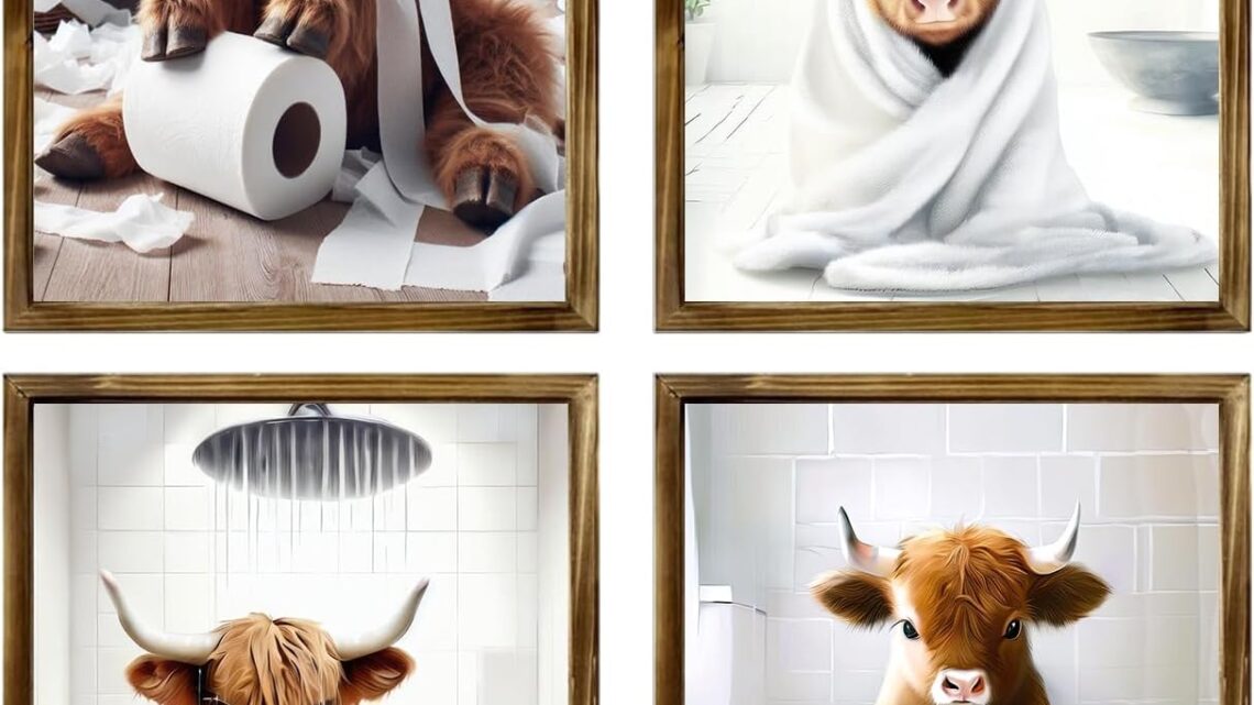 FUNNY BATHROOM WALL DECOR SIGNS:Add a touch of humor and personality to your bathroom decor with these funny and eye-catching art pieces.These art prints will add rustic charm and whimsy to any bathroom.Ideal for highland cow enthusiasts seeking unique bathroom art.Transform your walls with these playful scenes today!