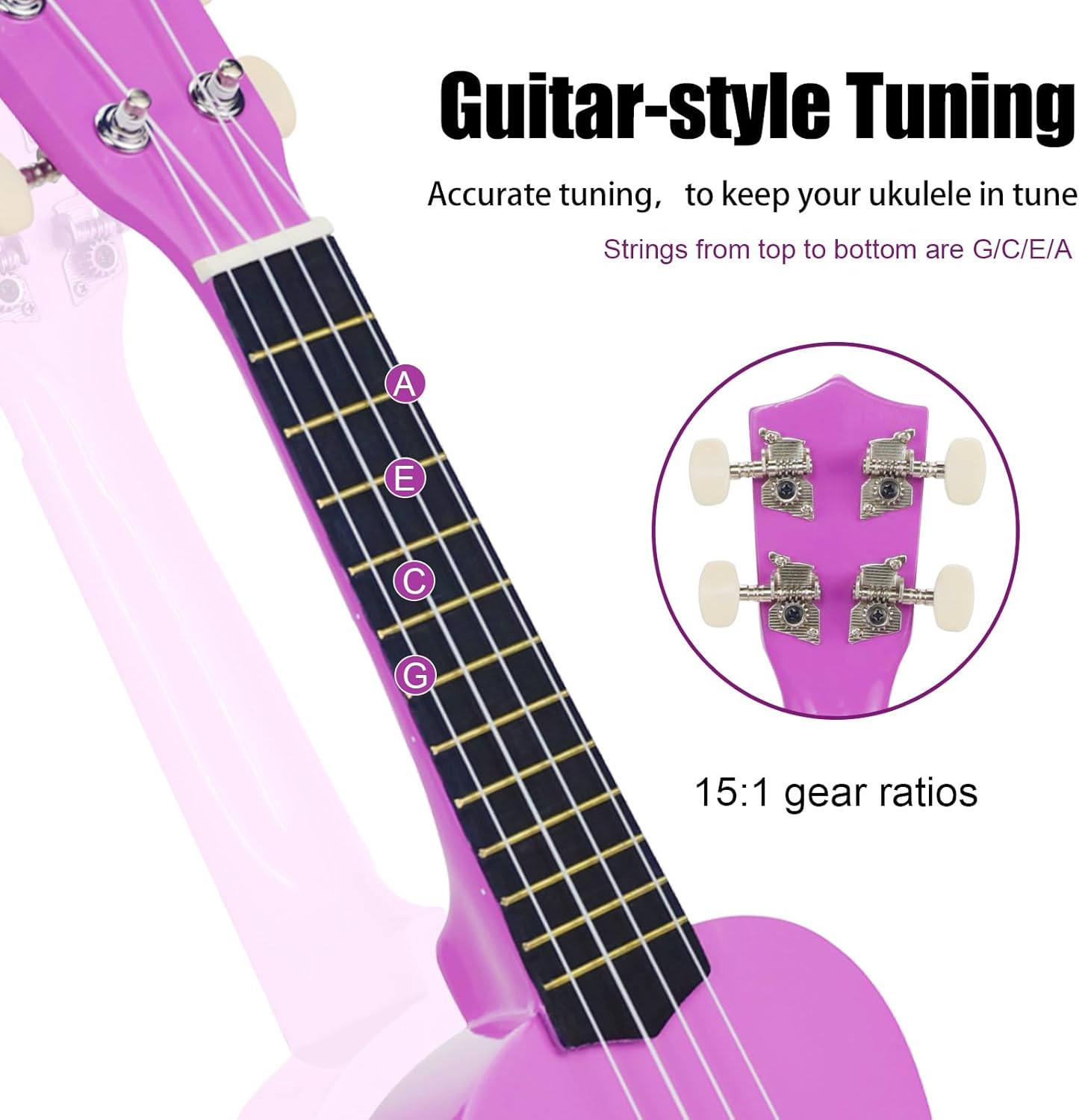 Sealed 15: 1 gear tuning machine: In the higher gears, the ukulele string can be tuned more precise, keep ukulele stay in tune better than 14:1 gear tuning pegs, ensures you would not be troubled by ‘out of tune’ so fast.