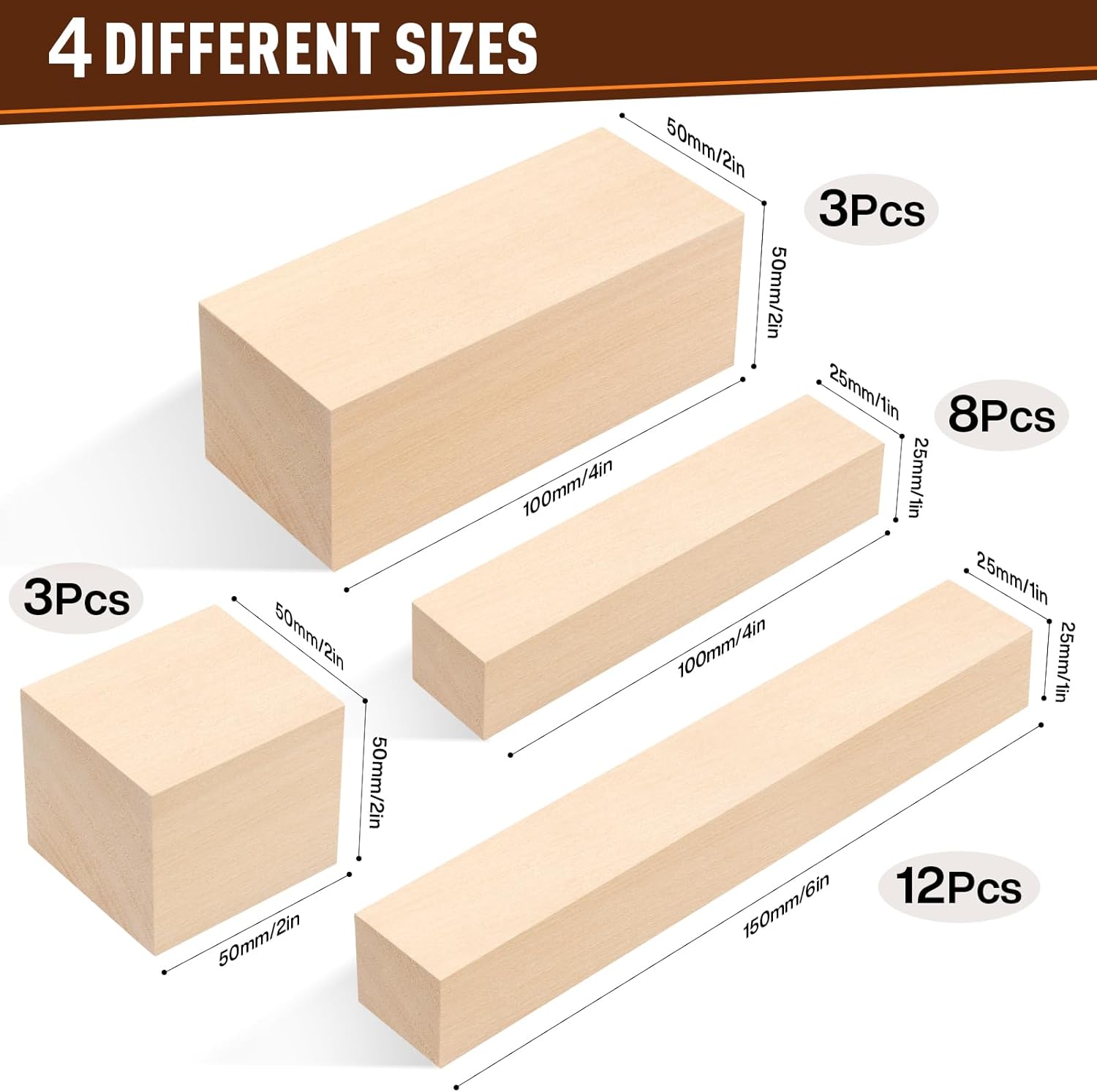 【What You Get】: The package contains 26 pieces of basswood blocks, 12 pieces 1x1x6 inches (2.5×2.5x15CM), 8 pieces 1x1x4 inches (2.5×2.5x10CM), 3 pieces 2x2x4 inches (5x5x10CM), 3 pieces 2x2x2 inches (5x5x5CM), 4 sizes can meet more carving needs and realize your amazing ideas.
