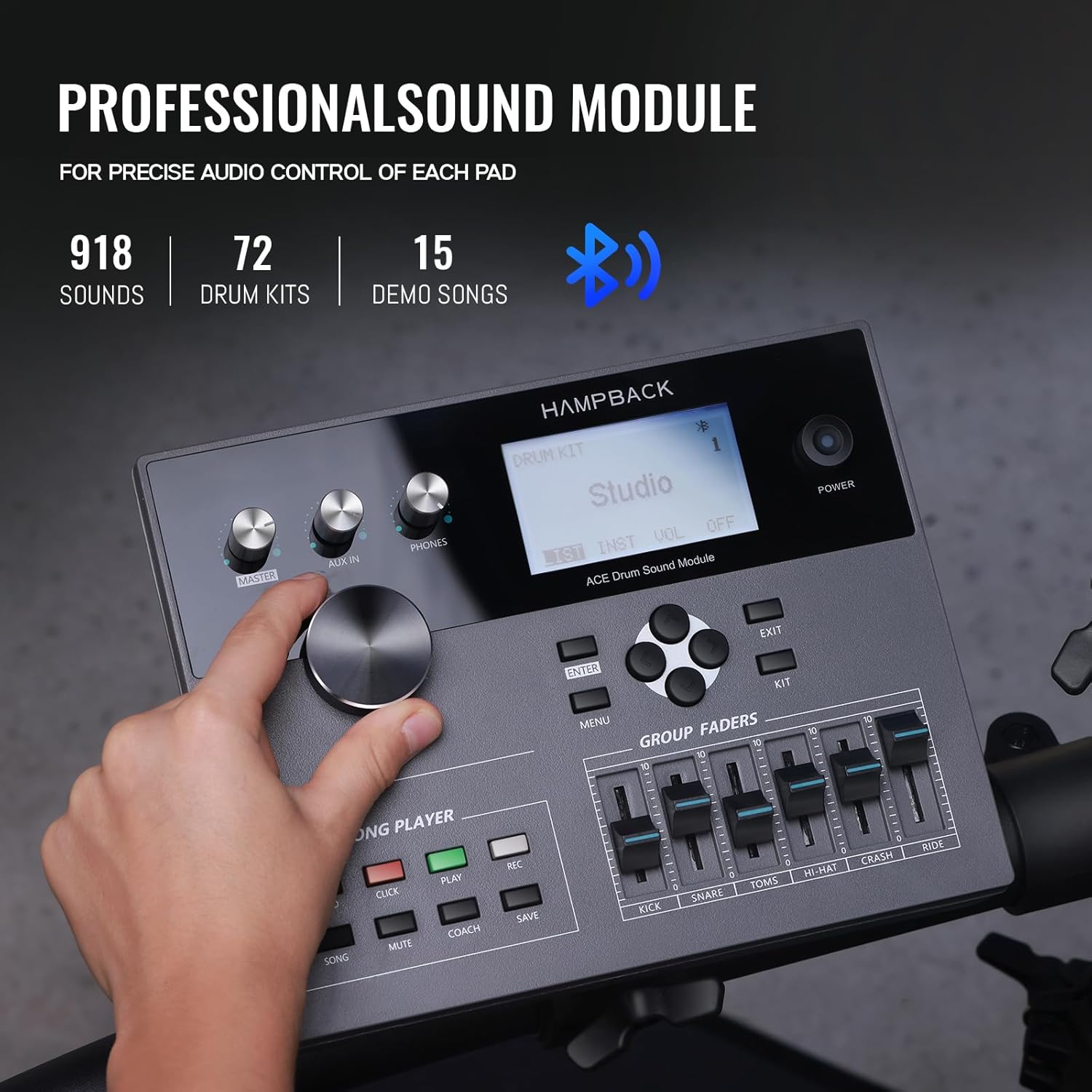 【Bluetooth & Power Bank Power Supply】Forget about worrying over power outlet availability – with our power bank-compatible electronic drum set, all you need is a power bank, and you can play anytime, anywhere. The ACE-310 sound module supports bluetooth connectivity, and boasts 918 sounds, 52+20 kits, and 15 songs, ensuring you’ll have more than enough joy of playing wherever you are.