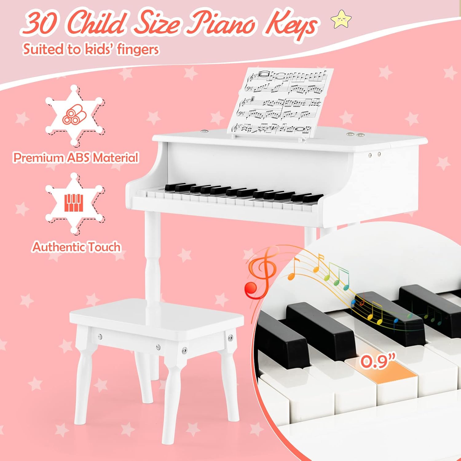 Goplus 30-Key Classical Kids Piano, Mini Grand Piano Wooden Learn-to-Play Musical Instrument Toy with Bench, Piano Lid, Music Rack, Gift for Boys Girls Aged 2+ Baby Tollder(3 Straight Leg-White)