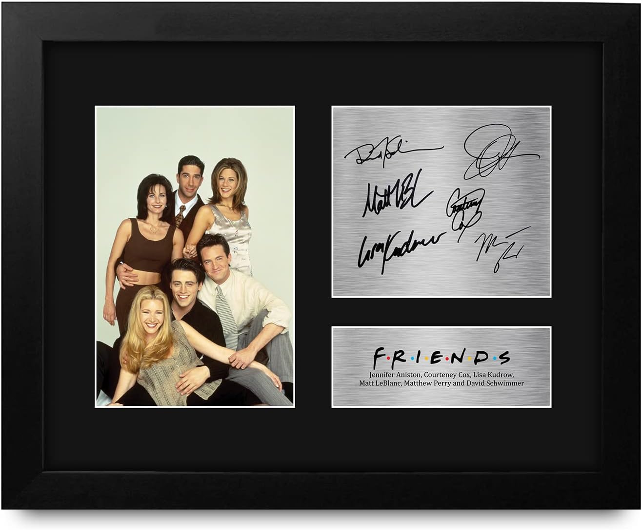 Professionally made in our studio, this US Letter Size (8.5×11 Inch) framed Friends display makes for an ideal gift idea. This laser printed quality photograph is mounted in a precision cut three windowed acid-free matt black display board. To the left of the display there is the main image. To the right of the display there are two metallic effect plaque areas for printed copies of the name and autograph signature. This print comes framed in a sleek black polycarbonate frame that compliments the matt mount display. Lightweight, but of the highest quality, these make the ideal Christmas/Birthday gift for fans of all ages, and best of all, they definitely won’t break the bank!