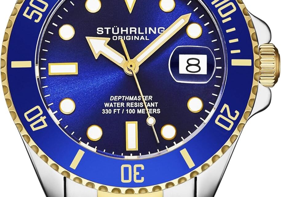 This Stuhrling Original Men’s Dive Watch features a stainless steel case and bracelet with a blue dial. It is water resistant up to 100 meters and has a Swiss quartz movement for accurate timekeeping. The watch also has a date display and is powered by a battery. The case is 40mm in diameter and 14mm thick, with a mineral crystal face protector. The bracelet is 20mm wide and has a fold-over clasp with safety. The watch has a two-tone gold and silver Bracelet and is perfect for everyday wear or for diving and other water activities.
