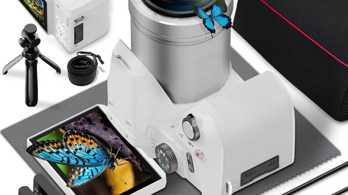 64MP 4K Digital Camera for Photography, Vlogging Cameras for YouTube with 3” Flip Screen,16X Digital Zoom, WiFi& Autofocus,Cameras Strap&Tripod,2 Batteries, 32GB TF Card(S200,White