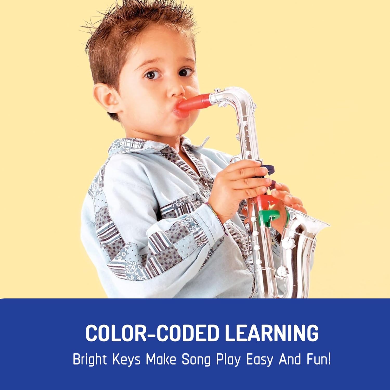 Click N’ Play Toy Saxophone for Kids with 8 Colored Keys, Kids Musical Instruments Ages 6-12, Plastic Saxophone in Metallic Silver, Great Musical Gift