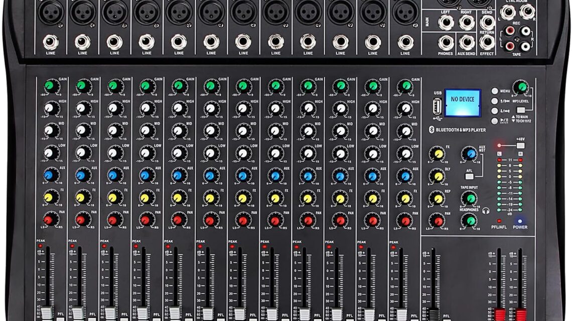 Depusheng DT12 Studio Audio Mixer 12-Channel DJ Sound Controller Interface w/USB Drive for Computer Recording Input, XLR Microphone Jack, 48V Power, RCA Input/Output for Professional and Beginners