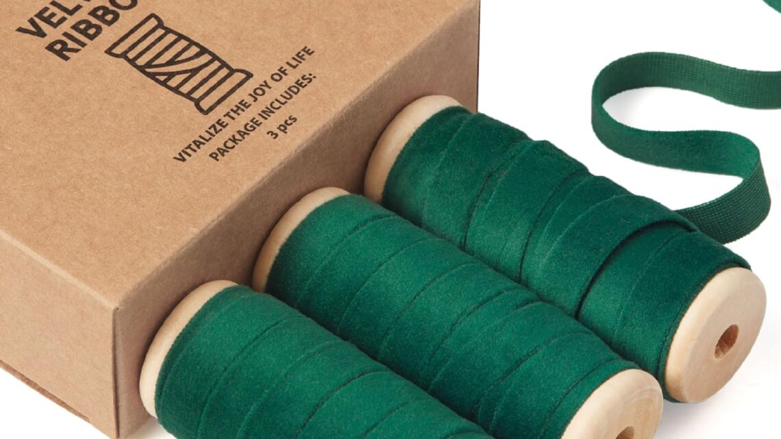 Vitalizart Green Velvet Ribbon Set 3/8″ x 15 Yd Wooden Spool Fabric Trim 3 Rolls * 5 Yd for Christmas Wreath Decoration Handmade Craft Ornaments Gift Wrapping Bow Making Dark Forest Green