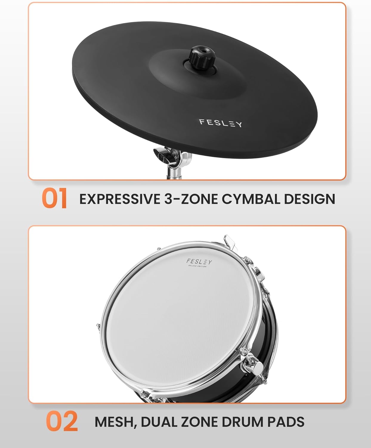 Fesley Electric Drum Set with Independent Kick Snare Drum HiHat Cymbal: Real Sample Sound Source, Bluetooth Electronic Drum Set with Dual Zone Mesh Drum Pad, Three Zone Cymbal Full Size Adult Drum Set