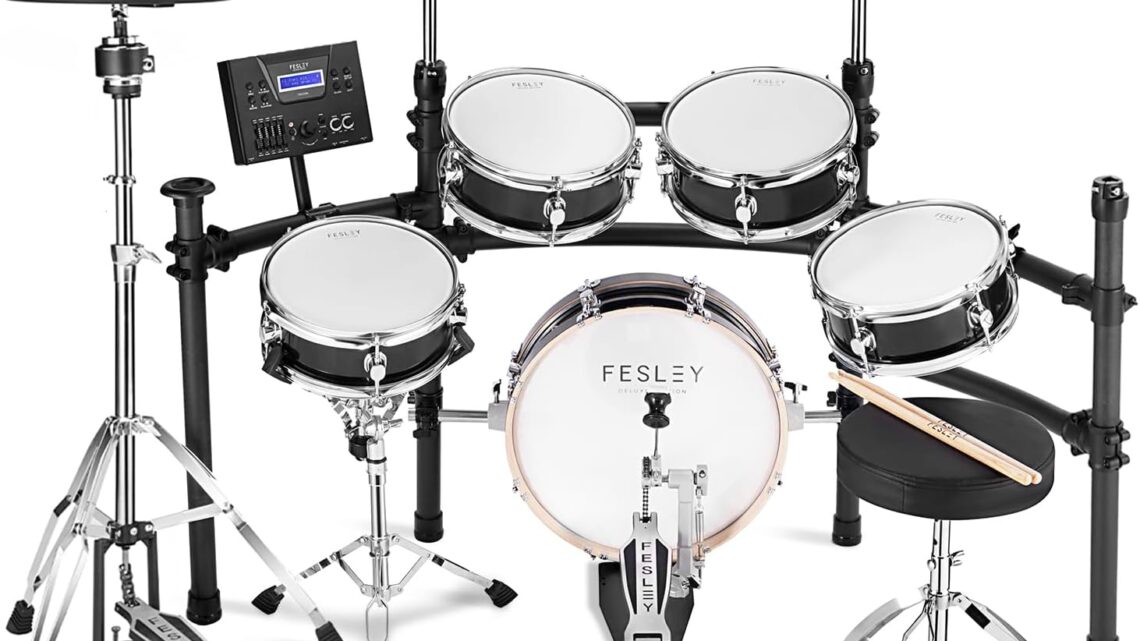 Fesley Electric Drum Set with Independent Kick Snare Drum HiHat Cymbal: Real Sample Sound Source, Bluetooth Electronic Drum Set with Dual Zone Mesh Drum Pad, Three Zone Cymbal Full Size Adult Drum Set