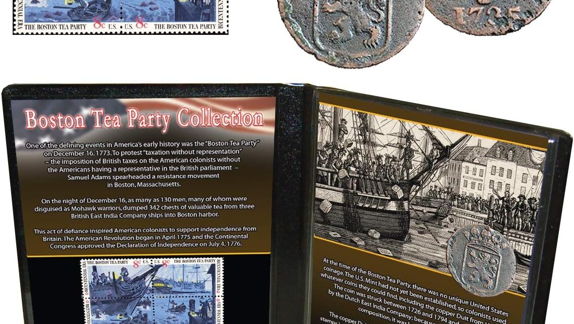 This commemorative coin & stamps set honoring the Boston Tea Party serves as a reminder of this crucial moment in American history.