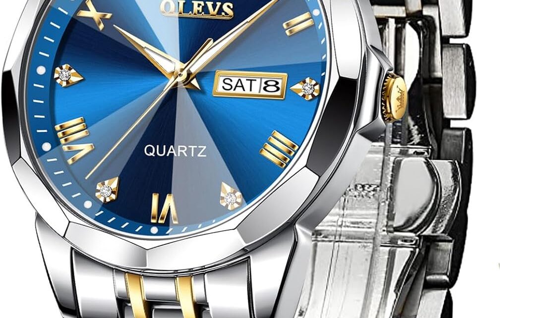 OLEVS Mens Watch Stainless Steel Analog Quartz Watches for Men Day Date Easy Read Diamond Waterproof Dress Luxury Classic Casual Big Face Blue/Black/Gold/Silver Roman Arabic Numerals Men’s Wrist Watch