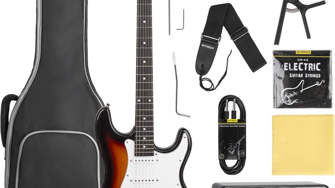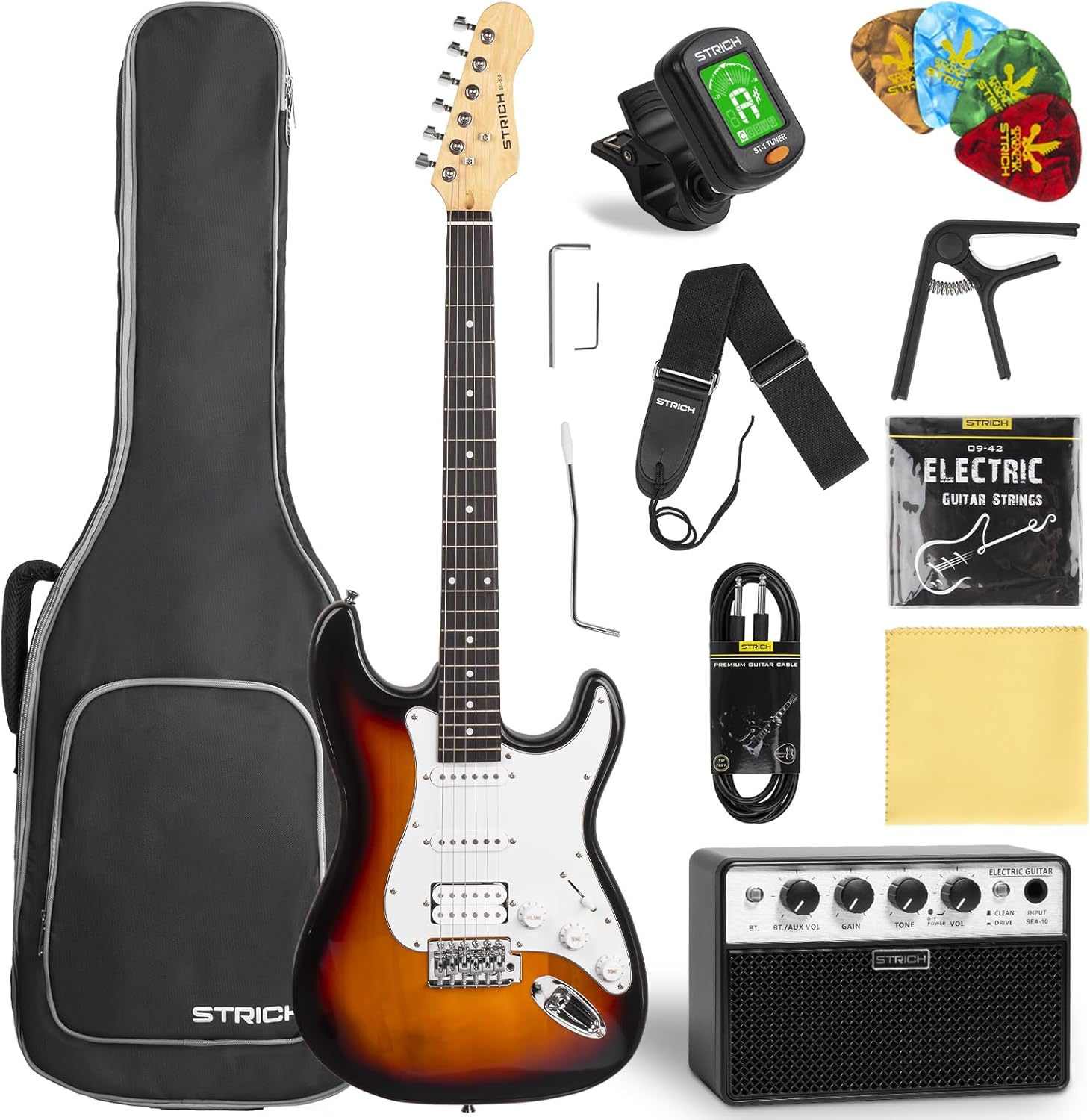 STRICH Electric Guitar Beginner Kit, Solid Body 39″ Full Size Electric Guitar HSS Pick Up for Starter, with 10W Amp, Bag, Digital Tuner, Capo, Strap, String,Cable, Picks, SST-S20 Sunburst