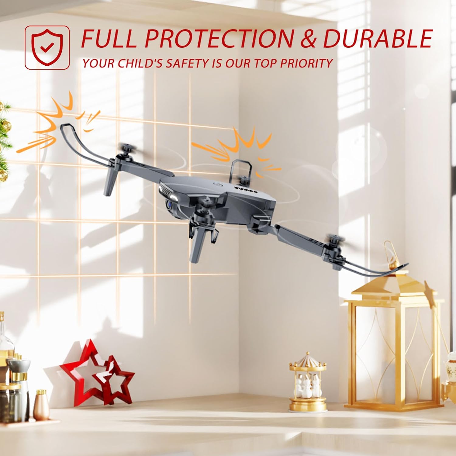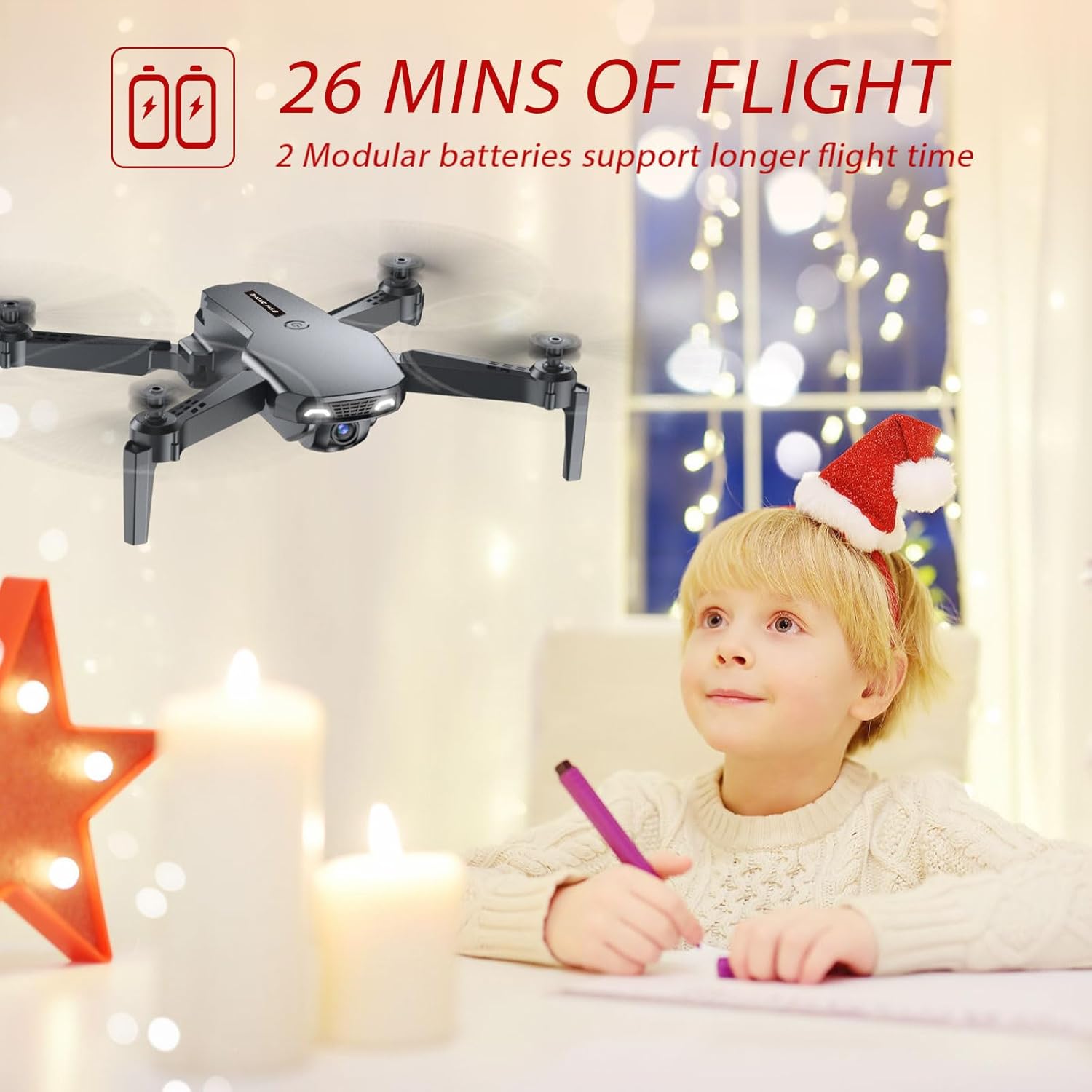 Safety-First Design & Extended Flight Duration: Features with Over-Current Protection, Emergency Stop, and 4 propeller guards ensure a safe and reliable flight. The controller is designed for a cool, game-like experience. With two rechargeable and powerful batteries, this kid’s drone offers an extended flight time of approximately 26 minutes, ensuring a worry-free and enjoyable flying experience