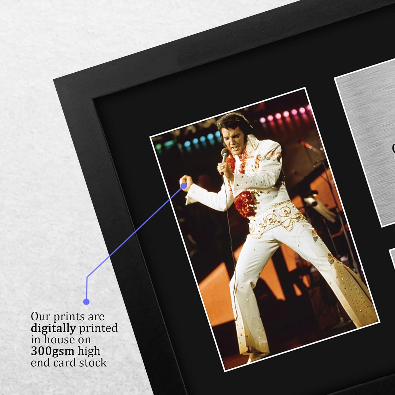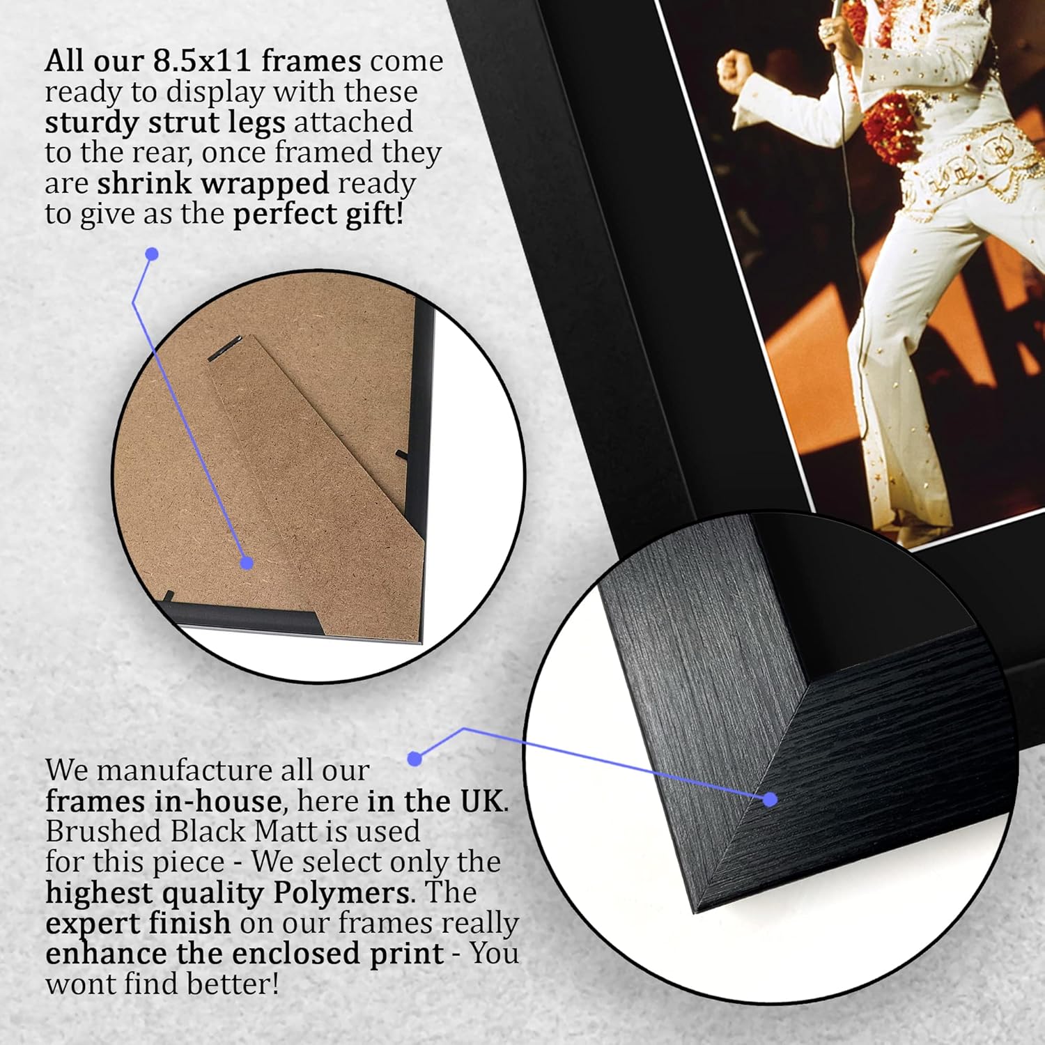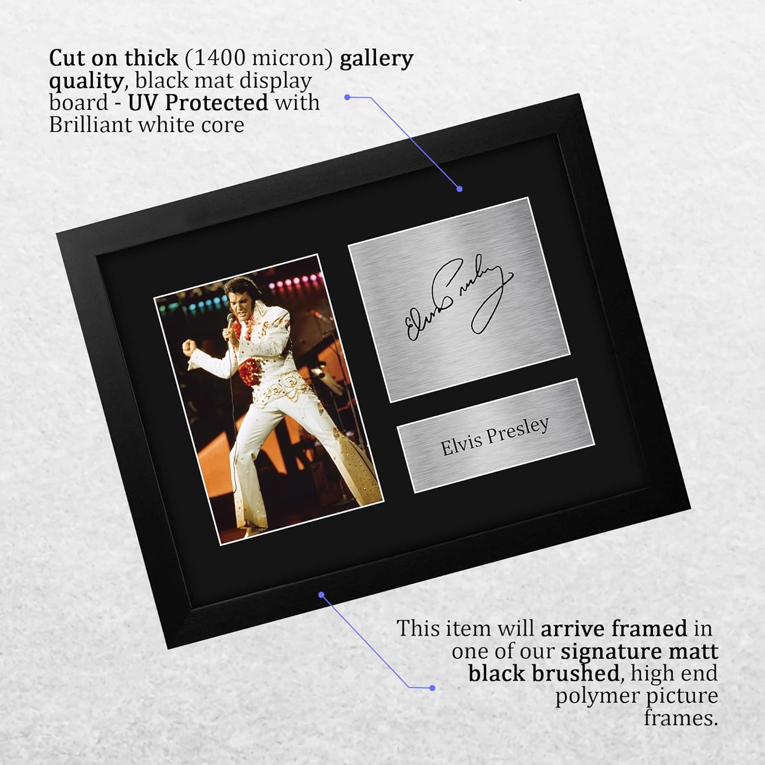 Professionally made in our studio, this US Letter Size (8.5×11 Inch) framed Elvis Presley display makes for an ideal gift idea. This laser printed quality photograph is mounted in a precision cut three windowed acid-free matt black display board. To the left of the display there is the main image. To the right of the display there are two metallic effect plaque areas for printed copies of the name and autograph signature. This print comes framed in a sleek black polycarbonate frame that compliments the matt mount display. Lightweight, but of the highest quality, these make the ideal Christmas/Birthday gift for fans of all ages, and best of all, they definitely won’t break the bank!