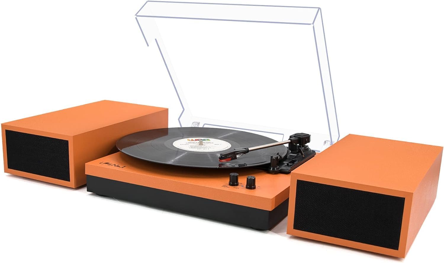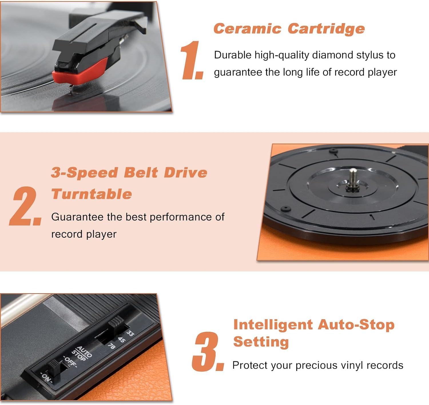 Vinyl Record Player, Vinyl Turntables with Dual Stereo Bookshelf External Speakers, Adjustable 3-Speed Belt-Drive Turntable, LP Player with RCA, Auto Stop,(Orange Leather Wrapped)