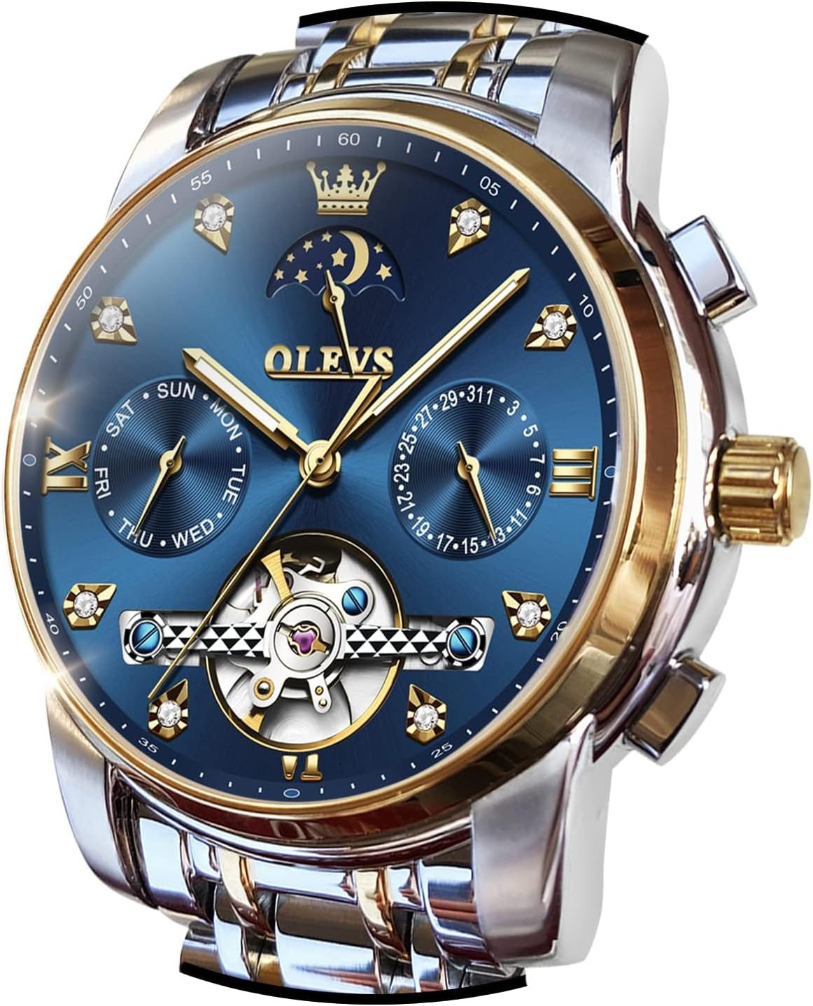 OLEVS Watches for Men Automatic Skeleton 5 Hands Mechanical Luxury Watch Classic Calendar Stainless Steel Waterproof Mens Wrist Watch