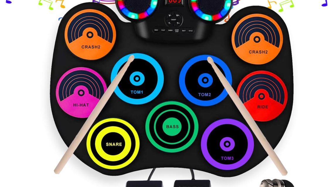 Electronic Drum Kit 9 Pads, Roll-up Practice Drum Set With Headphone and 2 Pairs Drumsticks, 8H Playing With Built-in Dual Speaker, USB MIDI Jack for Teens, and Adults Beginner, Hoilday Birthday Gift