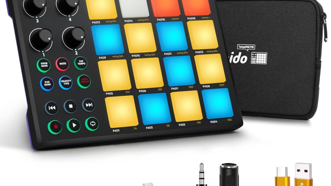 TempoPAD Midi Controller Beat Maker Machine for Music Production, Portable USB MIDI Beat Pad Controller for Beginners with Durable Carrying Bag, 16 Backlit Beat Pad, 4 Assignable Knob