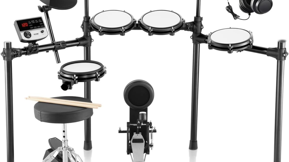 Complete Drum Kit: This electric drum set includes four 8″ drums, one 6″ kick drum, and three 10″ cymbals, giving you an entire striking area. The drum module, sticks, pedals, headphones, and an adjustable throne are included. It’s ideal for beginners and rhythm training!