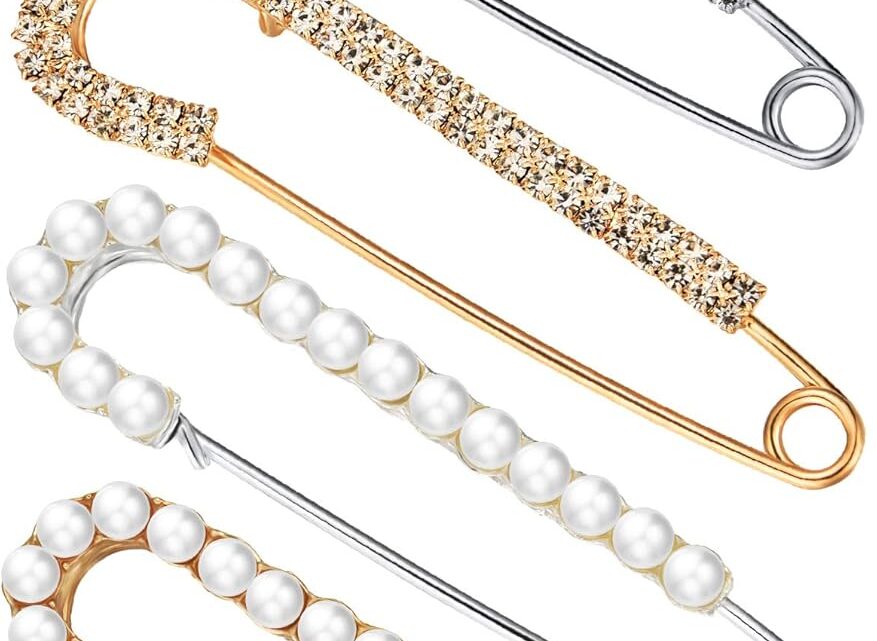 Women Brooch Pins Sweater Shawl Clips Faux Crystal Pearl Brooches Safety Pins Dress Shirt Clips for Women Gold Silver (4 Pieces)