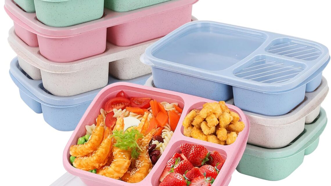 8 Pack Bento Lunch Box Set 3 Compartment Wheat Straw Meal Prep Food Storage Containers Plastic, Microwave and Dishwasher Safe(8 Pack(3 Compartment)