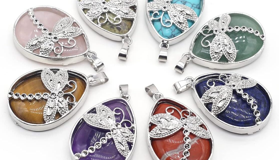 LE SKY 6 Pcs Natural Stone Pendants Waterdrop Shape Quartz Crystal Agate Stone dragonfly Pattern for Jewelry Making Necklace Bracelet