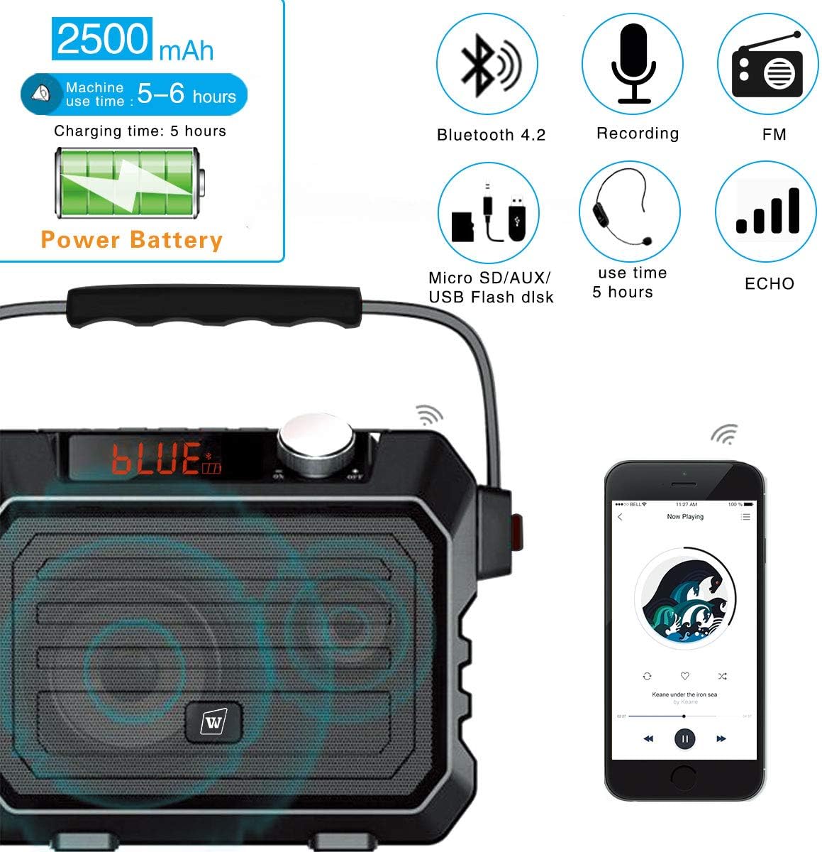 Output Power 30W High-capacity Battery 2500mAh Working Time 5-6 Hours Charging Time 3-5 Hours Mic Battery 550mAh Unit Weight: 3.3Lbs Size 9.25 x 3.5 x 6.5 inches Perfect for Teachers, Trainer, Tour Guide, Coach, Referee, Patients, Outdoor Activity, Sports Event, Public Speaking, Flea Market, Senior Home, Factory, Yoga Class, Gym, and Whoever & Wherever your voice needs to be heard clearly and loudly