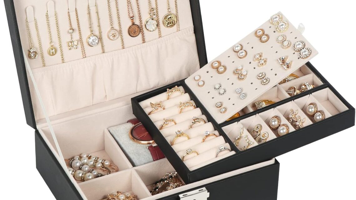 【MULTIFUNCTIONAL & PRACTICAL】– The jewelry organizer box include 2 layers. Top lid with 8 hooks and lower elastic pocket to keep necklaces, chains and pendants in place and tangle free. Middle stackable tray include 15 unique earrings location special for hanging hook earring, 10 ring rolls, 1 adjustable ear stud plate can hold 74 earrings and underneath section. 6 divided bottom compartments to store rings, bracelets,earrings,watches etc. Lots of options to hold various sizes of jewelry