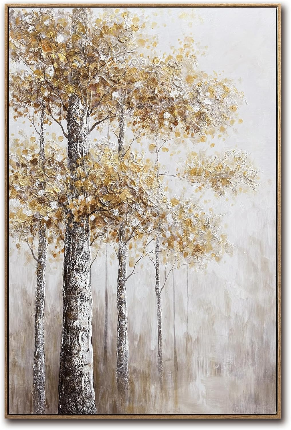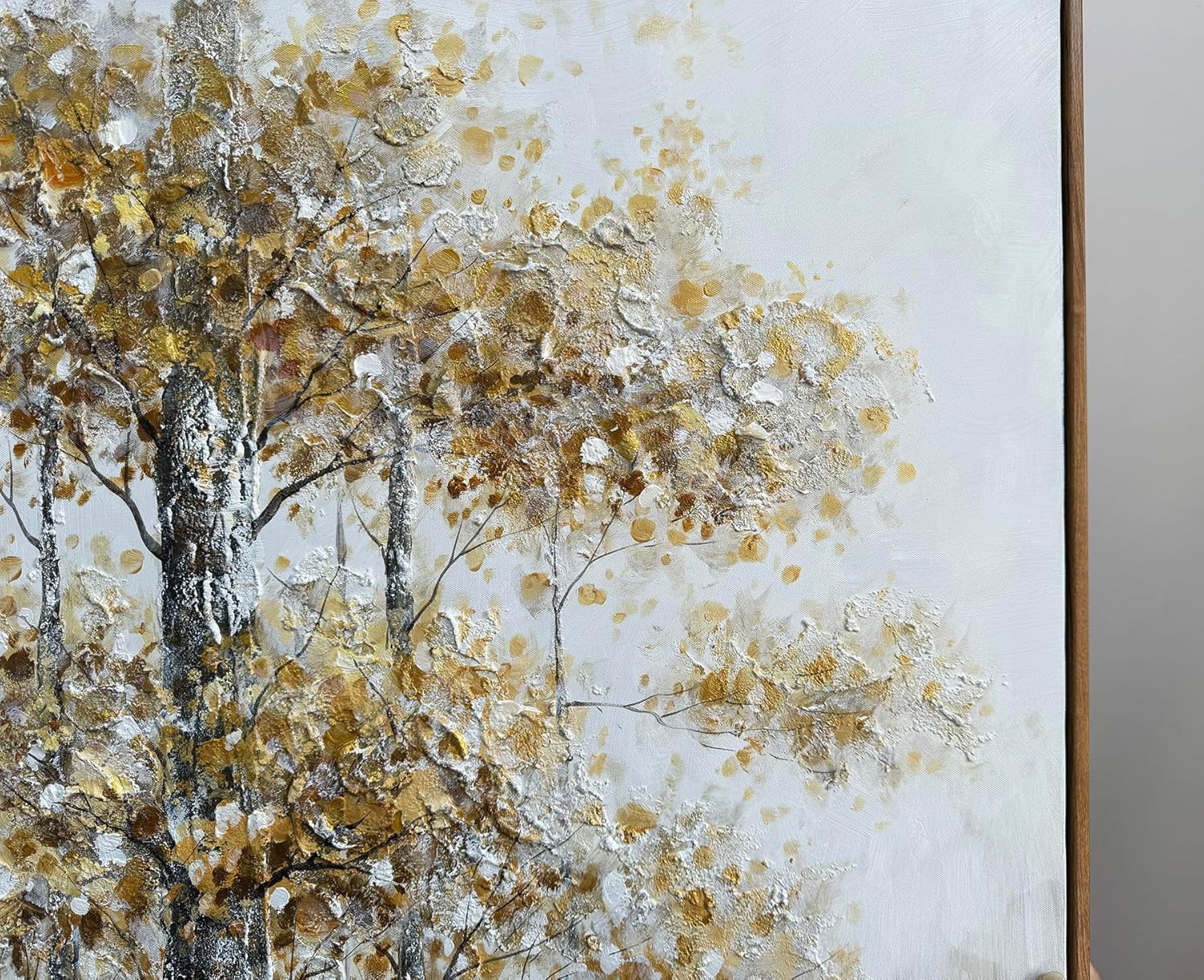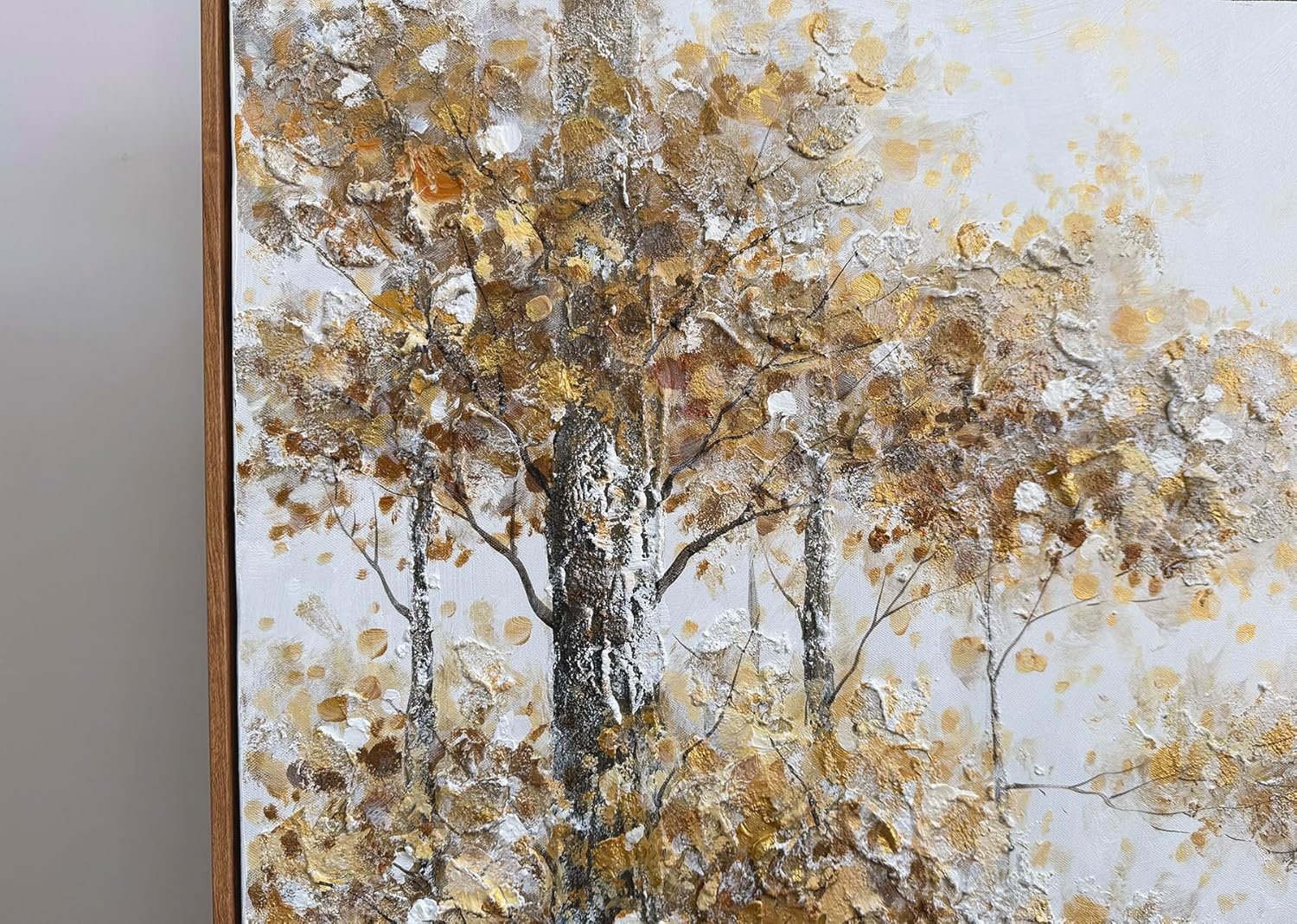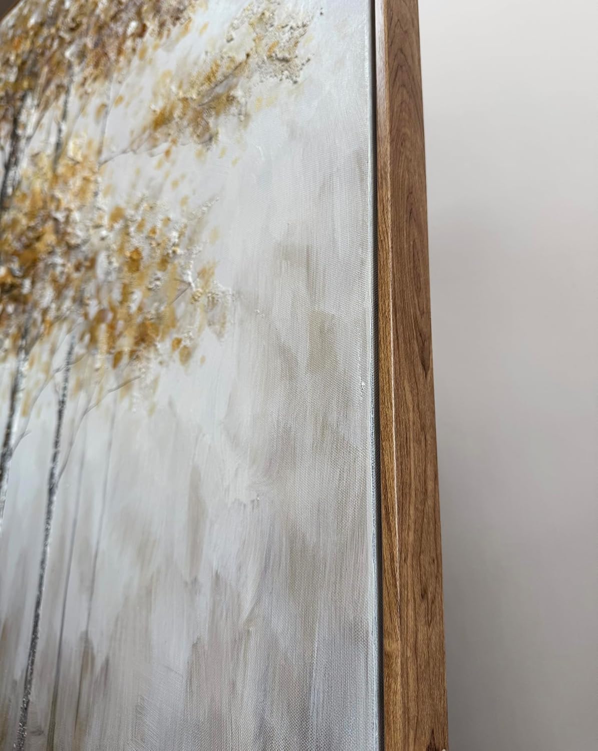 Transform your living space with this stunning 24×36 inch hand-painted canvas artwork that captures the serene beauty of a forest landscape. The modern impressionist style portrays majestic birch trees with textured bark details, set against a soft, misty background. Golden autumn foliage crowns the trees, creating a warm and inviting focal point. The artist’s skillful use of acrylics brings depth and dimension through varied brushstrokes and textures. Housed in an elegant peach wood frame, this piece is ready to hang and makes a sophisticated statement in any room. The neutral palette of whites, golds, and earthy tones complements various interior styles, while the generous size ensures it commands attention without overwhelming the space. Perfect for creating a calming atmosphere in your living room, bedroom, dining area, or any space that needs a touch of natural elegance. The painting’s dreamy quality invites contemplation and adds a sense of tranquility to your home decor.