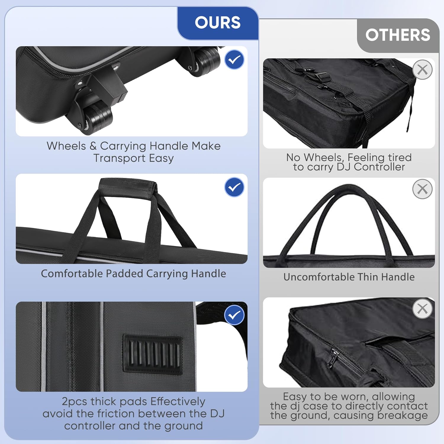 3 Ways to Carry DJ Roller Bag: The DJ Case offers Large wheels, shoulder strap, backpack straps, carrying-handle, top-handle. The DJ case comes with wheels and top-handles for easy portability; The shoulder strap is soft padded, adjustable and removeble; the backpack straps can be hidden; the carrying handle is padded and comfortable