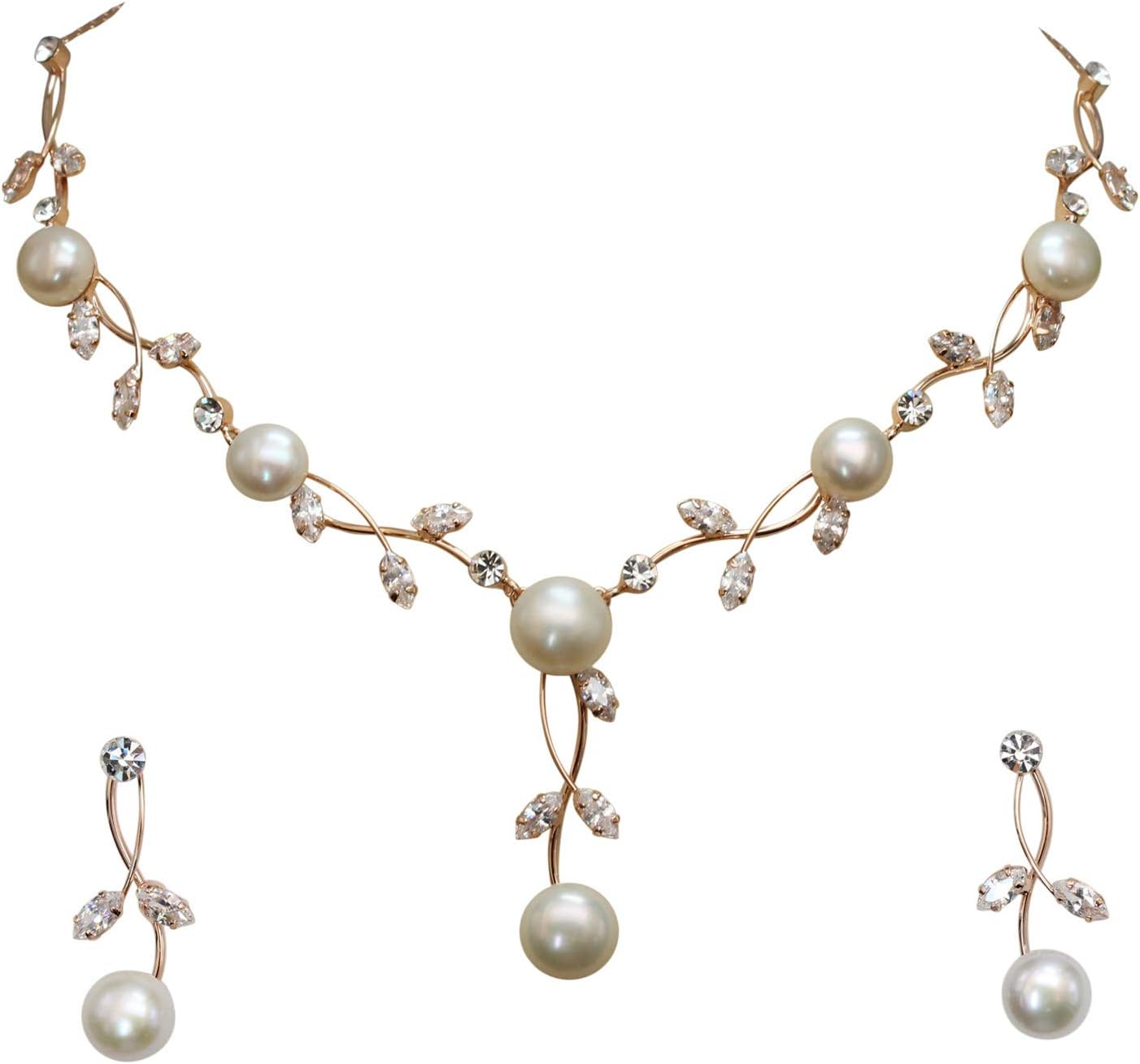 Faship Gorgeous CZ Crystal Genuine Freshwater Pearls Floral Necklace Earrings Set