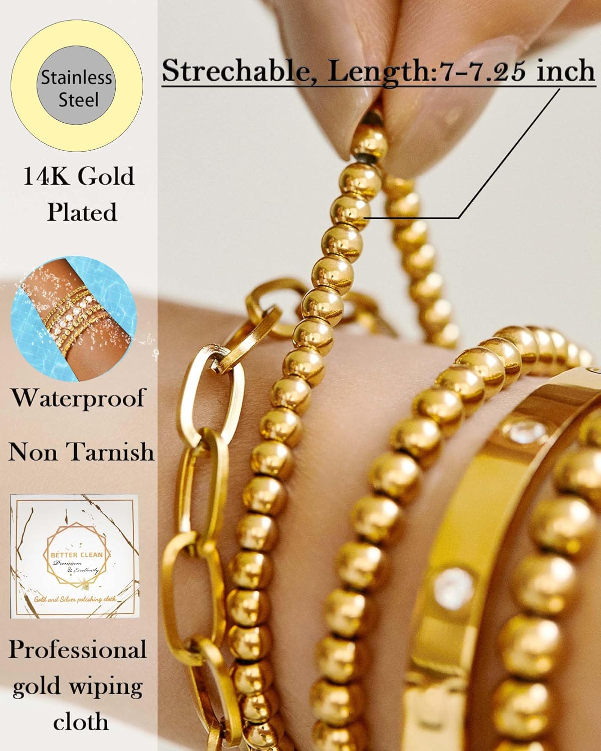 Gold Bangle Bracelets for Women, 14K Gold Plated Beaded Bracelets Stretch Bead Ball Chain Layered Bracelet Stack Set, Love Cubic Zirconia Bangle Women Jewelry